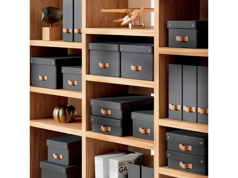 - Stilfuldt håndtag i læder gør kasserne nemme at få ud af hylder, reoler, klædeskabe og skabe
