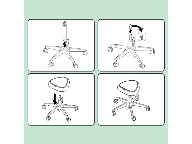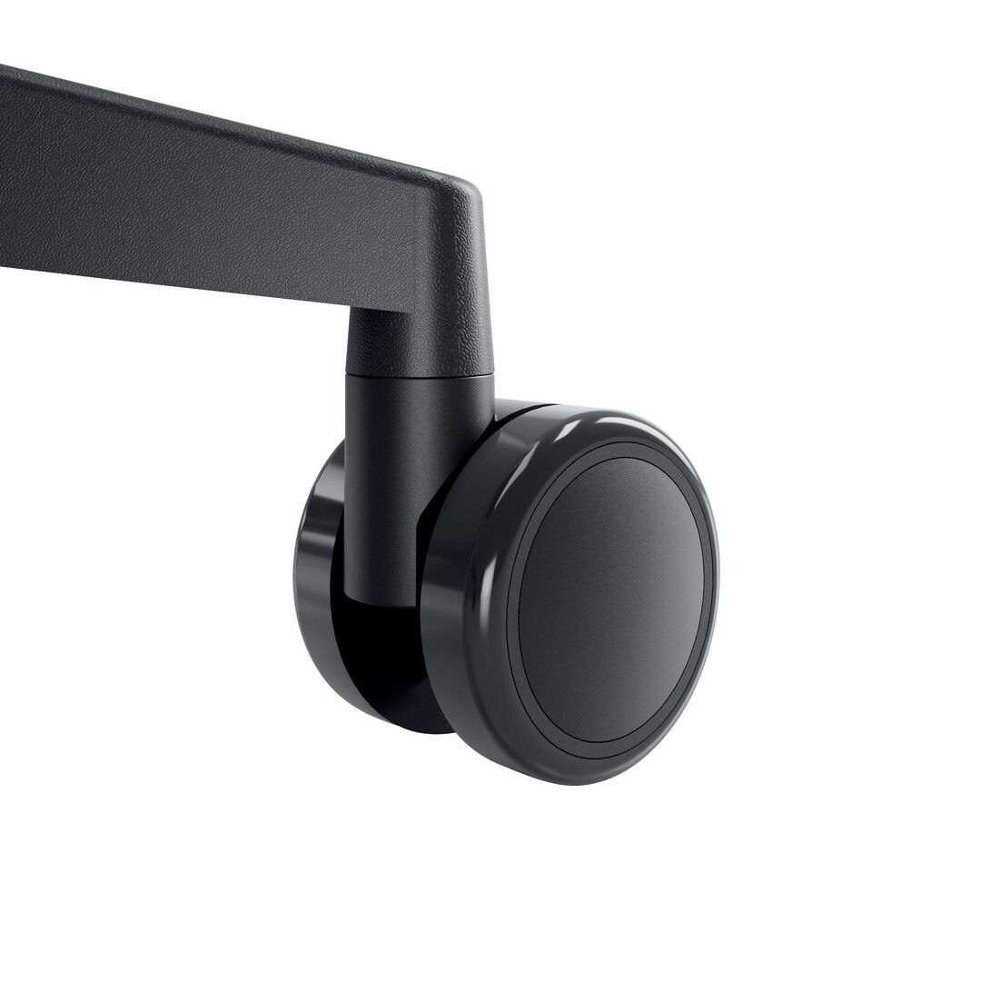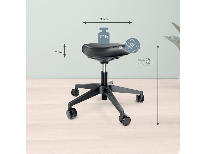 Den har 5 letrullende hjul, der passer til alle gulvtyper, og er designet til at kunne dreje 360°, så den er nem at flytte rundt ved skrivebordet eller fra rum til rum. Hjulene øger modstanden, når stolen ikke er i brug, hvilket øger sikkerheden og forhindrer utilsigtede bevægelser. Med en bredere base på 60 cm giver disse GS- og TÜV-certificerede (sikkerhedstestet) taburetter øget stabilitet og forhindrer, at de vælter. Juster stolen til din perfekte højde (46 - 59 cm) med en af de 3 lettilgængelige trykknapper under skamlen. Det kompakte, pladsbesparende design gør det nemt at opbevare den under et skrivebord.
