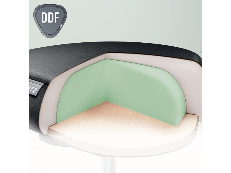 Leitz Ergo arbejdsstol hjælper dig med at være komfortabel og produktiv gennem hele din arbejdsdag! Den har et trekantet sæde, der former sig efter din krop som en sadel og hjælper med at fordele din vægt jævnt for øget komfort. Sædet er lavet af et unikt 9 cm tykt Dual Density Foam (DDF). Det betyder, at skummet har to lag: et fast indre lag for stærk støtte og et blødere ydre lag for komfort. Denne kombination hjælper dig med at bevare en god kropsholdning og reducerer presset på dine ben, hvilket gør det lettere og mere behageligt at sidde i længere tid uden ubehag.