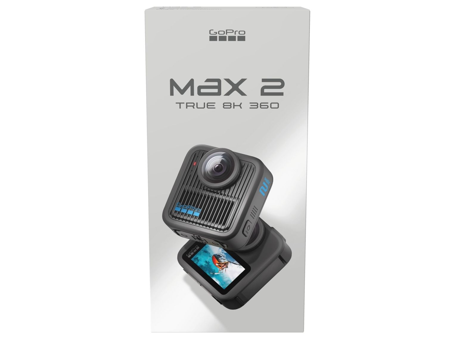 GoPro MAX 2, NOT " MAX2 fotocamera per sport d'azione 29,5 MP 8K Ultra HD 25,4 / 2,3 mm (1 / 2.3") Wi-Fi 195 g. HD type: 8K Ultra HD, Maximum frame rate: 100 fps, Video formats supported: HEVC/H.265, MP4. Total megapixels: 29.5 MP, Optical sensor size: 25.4 / 2.3 mm (1 / 2.3"), Maximum image resolution: 7680 x 3840 pixels. Display: LCD, Display diagonal: 4.62 cm (1.82"), Display resolution: 252 x 432 pixels. Maximum focal length (35mm film equiv): 26 mm, Minimum focal length (35mm film equiv): 14 mm. Minimum focusing distance: 1.4 cm