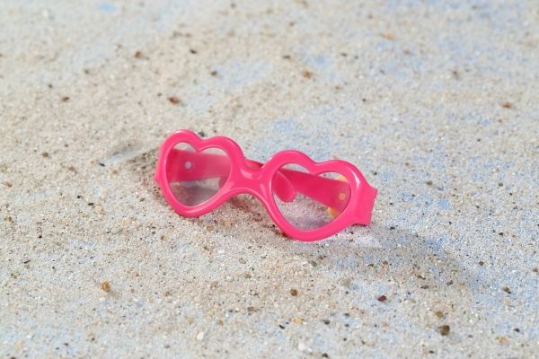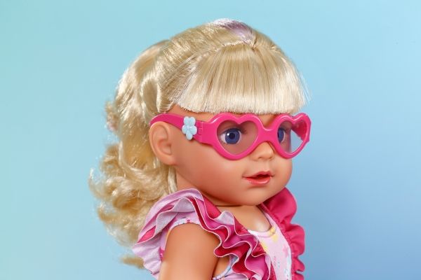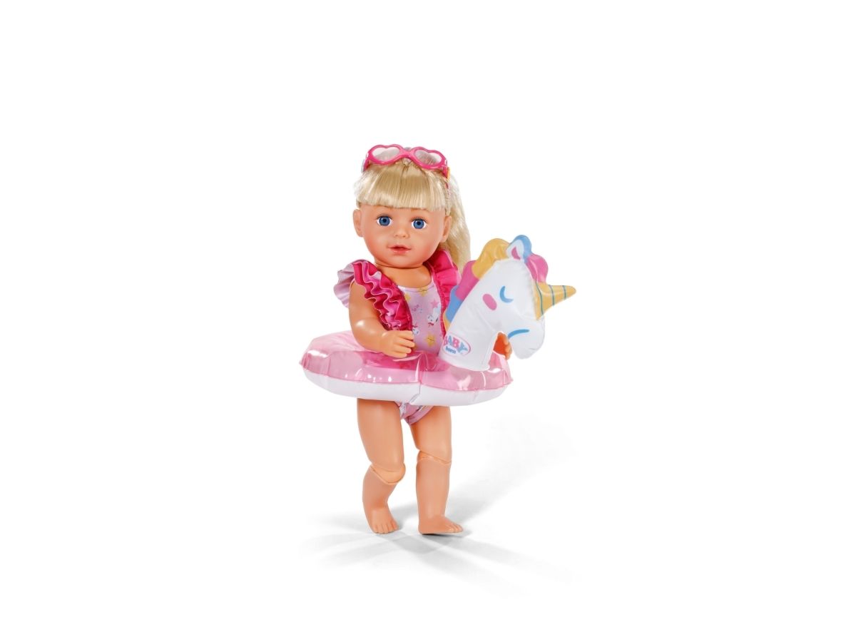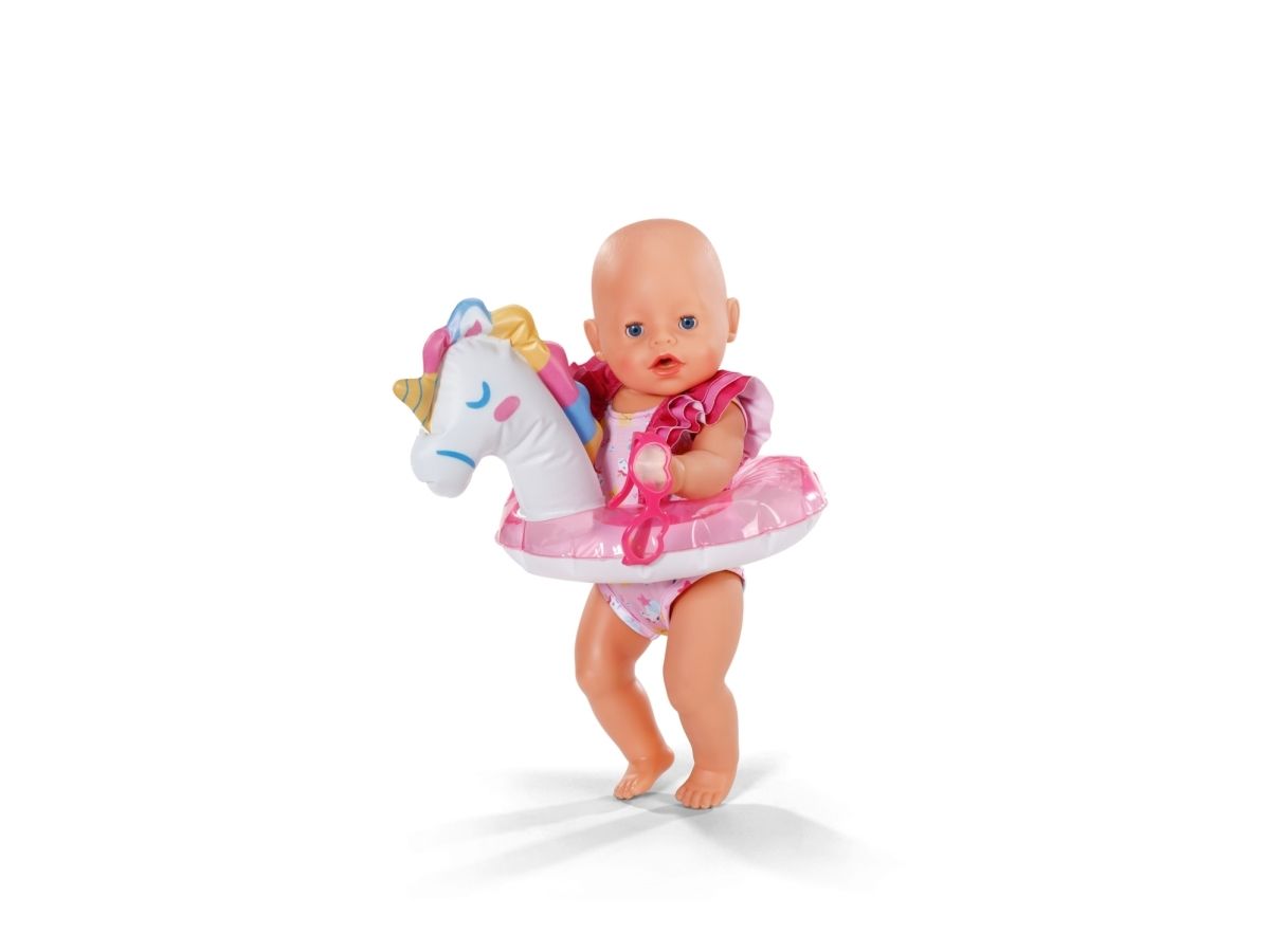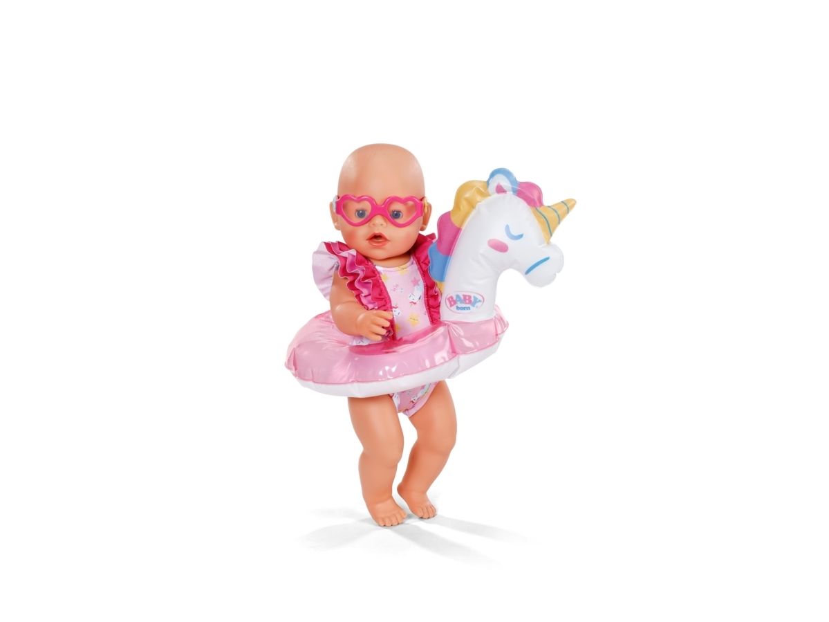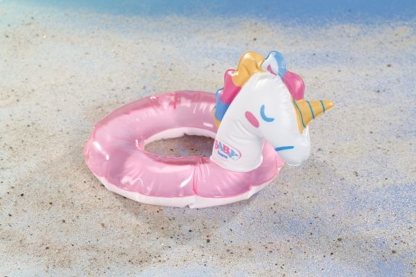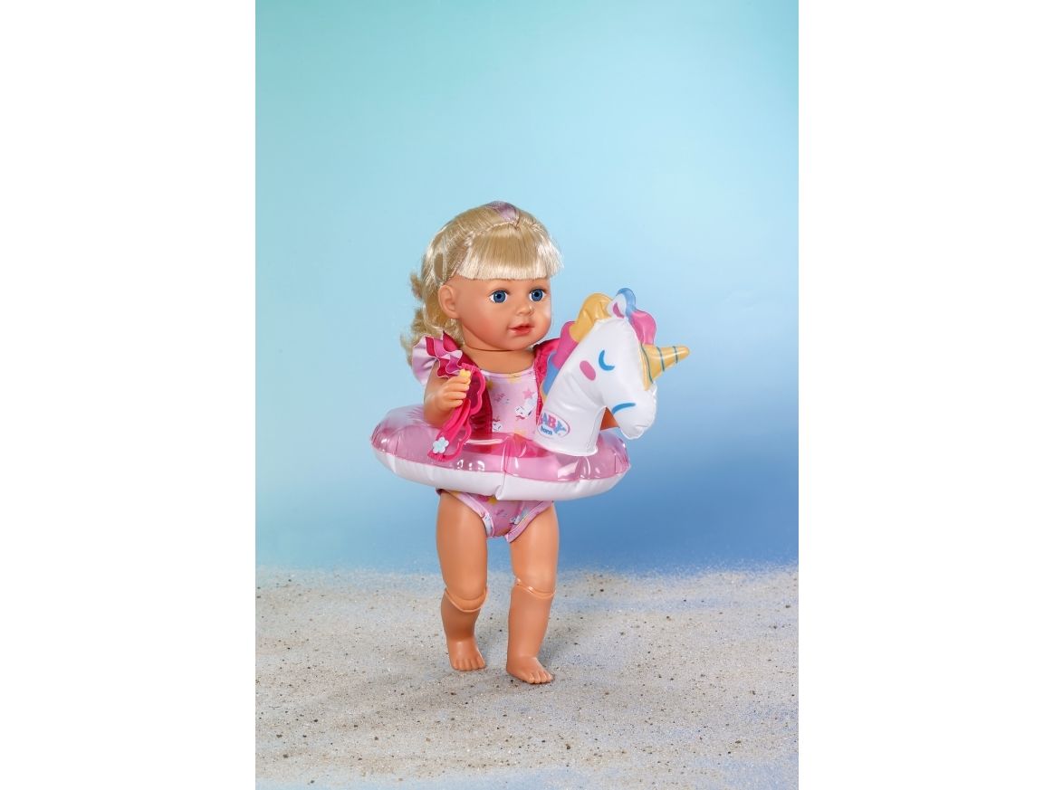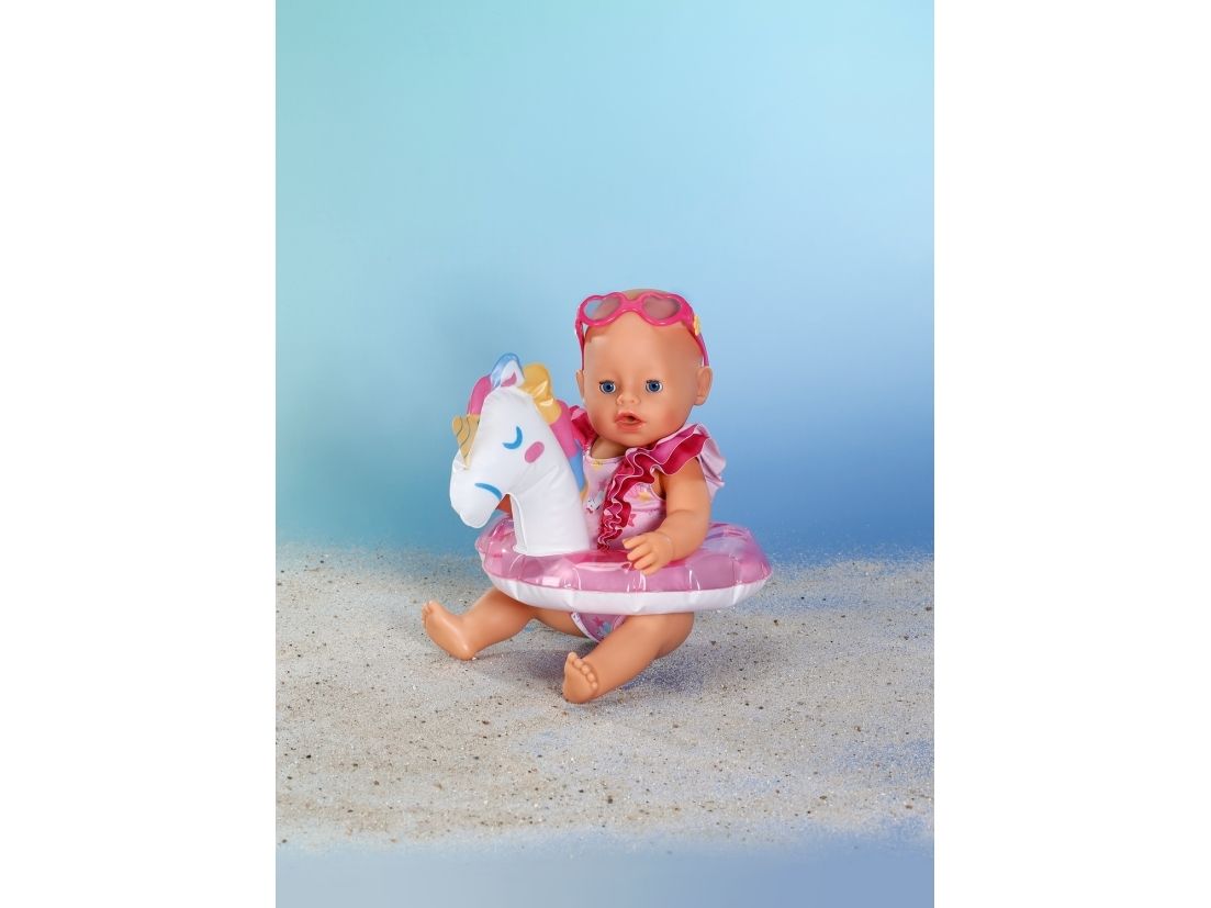 Swim set for 43cm doll. Swimsuit, sunglasses, slippers and inflatable unicorn swim ring.