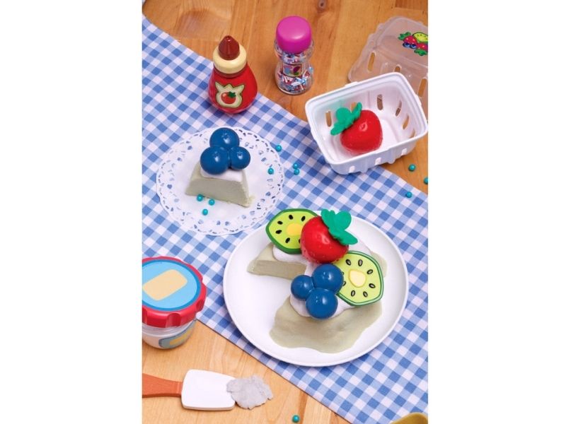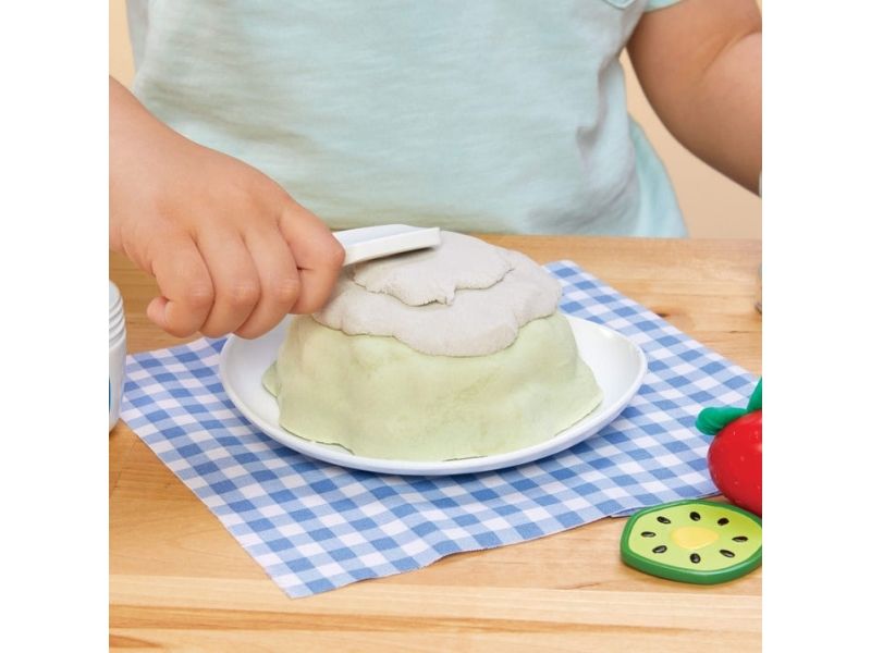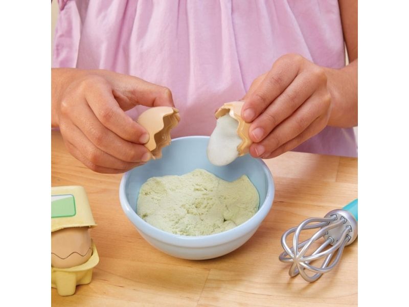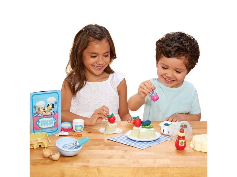 Creative Chefs Bluey Pavlova Kit empowers kids to get creative through hands-on learning and imagination. With highly detailed, functional pieces kids build their dish and create their own replicas of their favorite character's special treat. 20 realistic cooking accessories including serving plate, pavlova mold pan, whisk, spatula, egg carton, 2 eggs with play sand, sprinkles container, fruit container, 2 strawberries, 2 blueberries, 2 kiwi slices, tomato paste bottle, cream container with play sand, sugar bag with play sand, mixing bowl and recipe card. From 3 years.