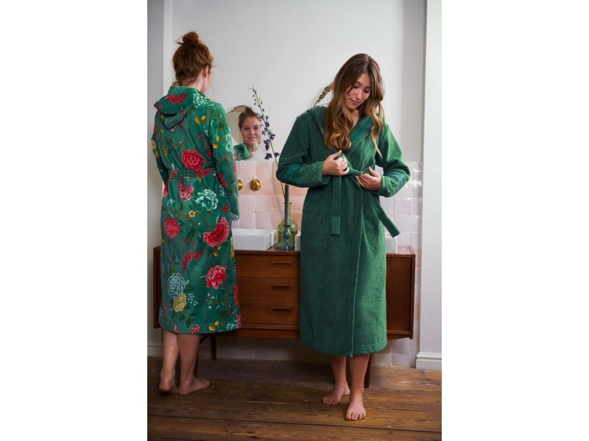 Denne PIP Good Evening badekåbe i størrelse XS er perfekt til de hyggelige aftener og morgener, hvor du ønsker at slappe af og forkæle dig selv. Badekåben er fra det populære brand Pip Studio og er designet i en smuk mørkegrøn farve. Badekåben er fremstillet af 100% bomulds velour frotte, hvilket gør den utrolig blød og behagelig at have på. Den er perfekt til at tage på efter et varmt bad eller til at hygge i på en kold vinteraften. Badekåben har en behagelig pasform og lukkes med et bælte omkring taljen. Du kan nemt vaske badekåben på 30° uldprogram, så den altid er ren og lækker at tage på. Med denne PIP Good Evening badekåbe er du sikret både komfort og stil, når du skal slappe af derhjemme.