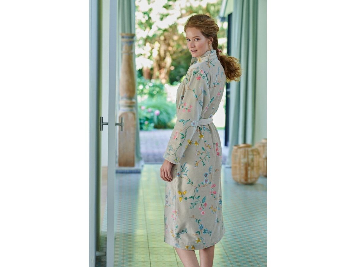 Denne smukke PIP Les Fleurs Bathrobe Khaki L er en lækker og behagelig badekåbe, i et smukt blomstret mønster, som er fremstillet i 100% bomulds frotte. perfekt til hygge lige efter badet. Den er af mærket PIP Studio, og er i farven Khaki. Badekåben er en størrelse L, og materialet er 100% bomulds velour frotte. Den kan maskinvaskes ved 30° C.