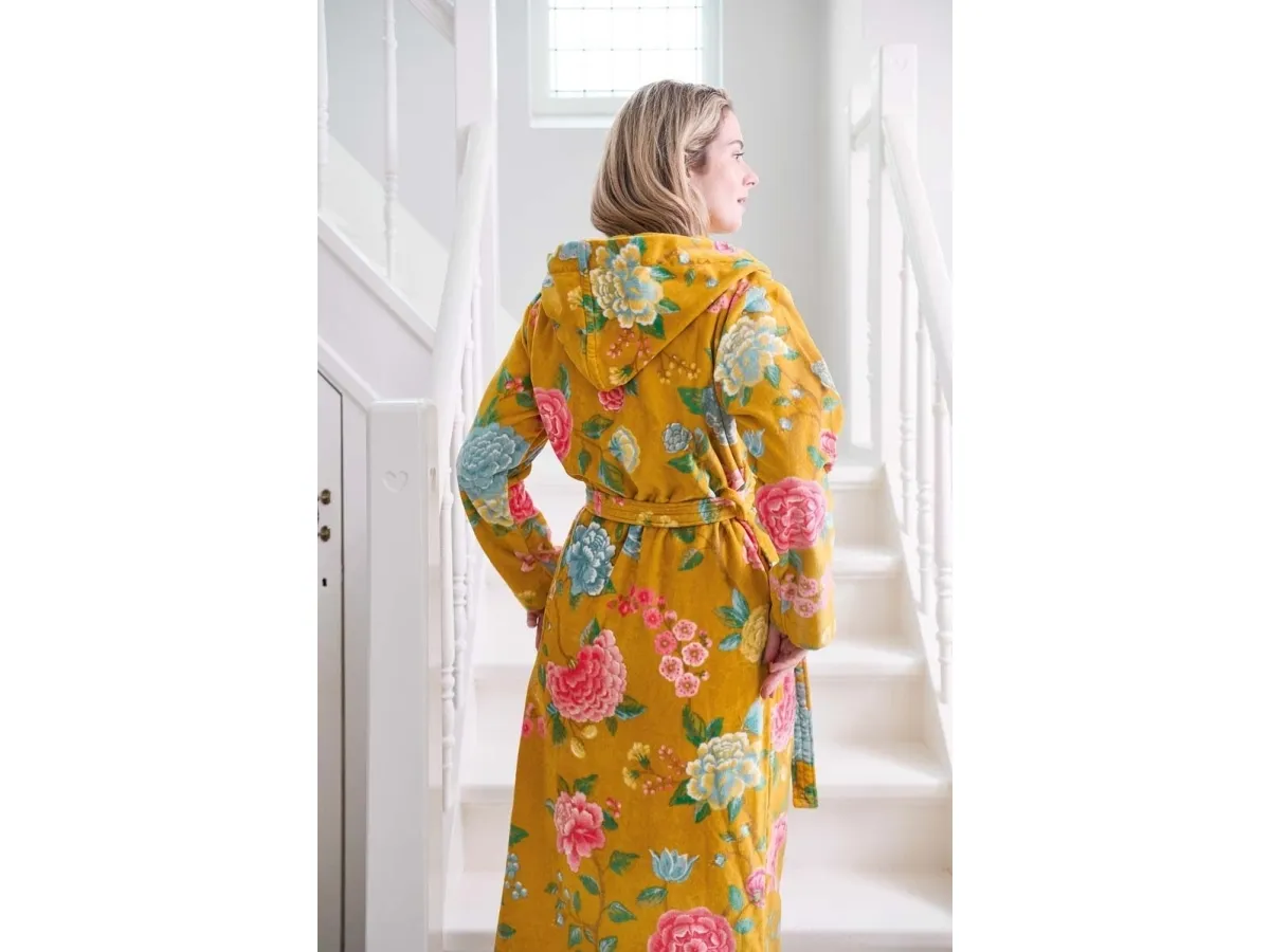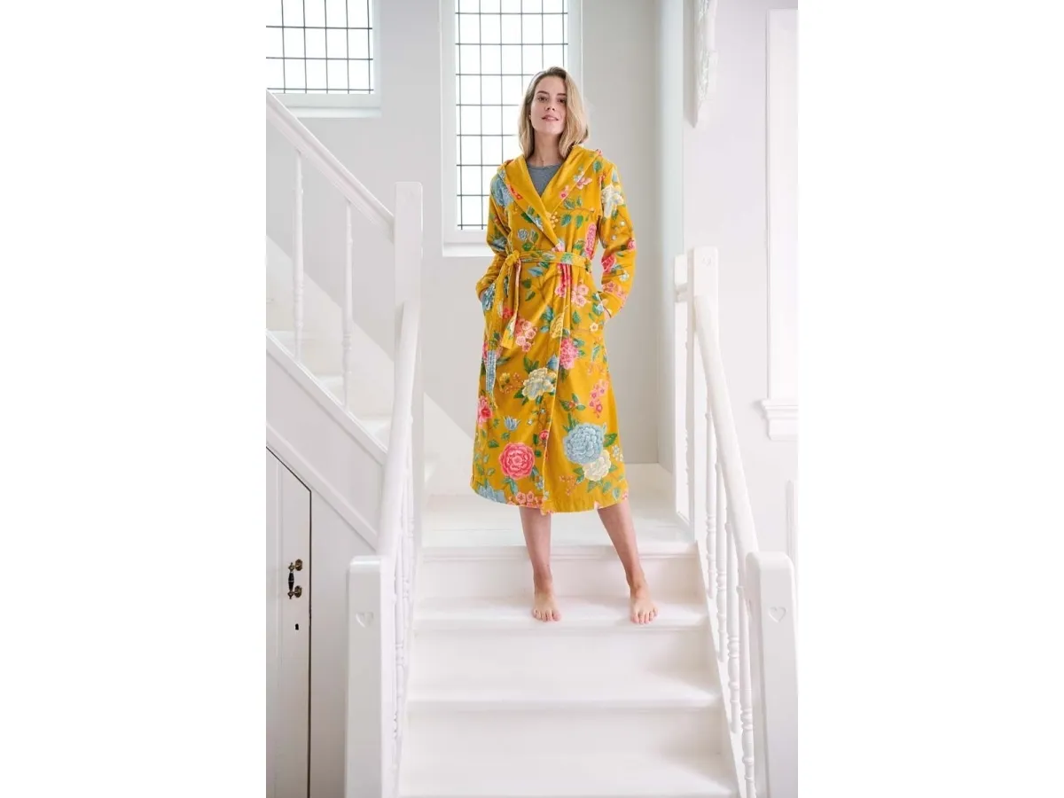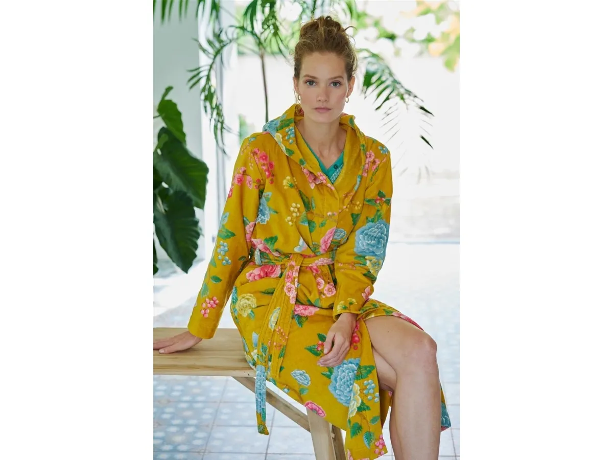 PIP Good Evening Badrobe Yellow S er en lækker og behagelig badrobe fra det populære PIP Studio. Badroben er fremstillet af 100% bomulds velour frotte og er i den klassiske farve gul. Den har en behagelig pasform, og er en størrelse S. Badroben er let at vedligeholde og kan maskinvaskes ved 30°C. Dette er den perfekte badrobe til de kølige aftener.