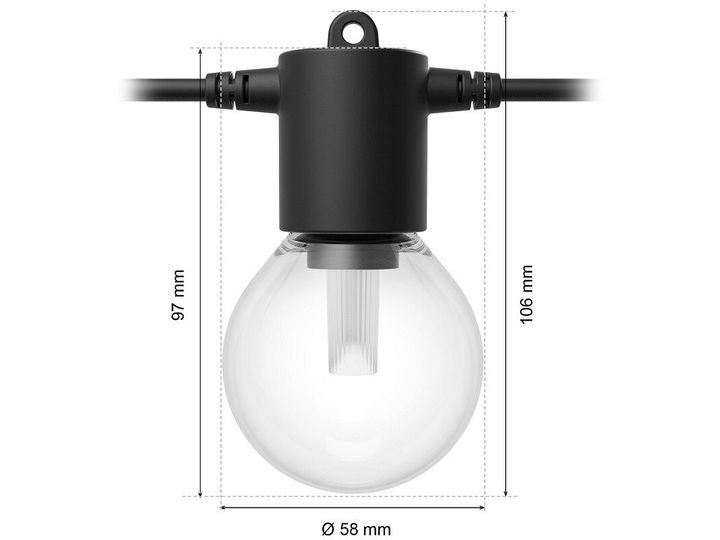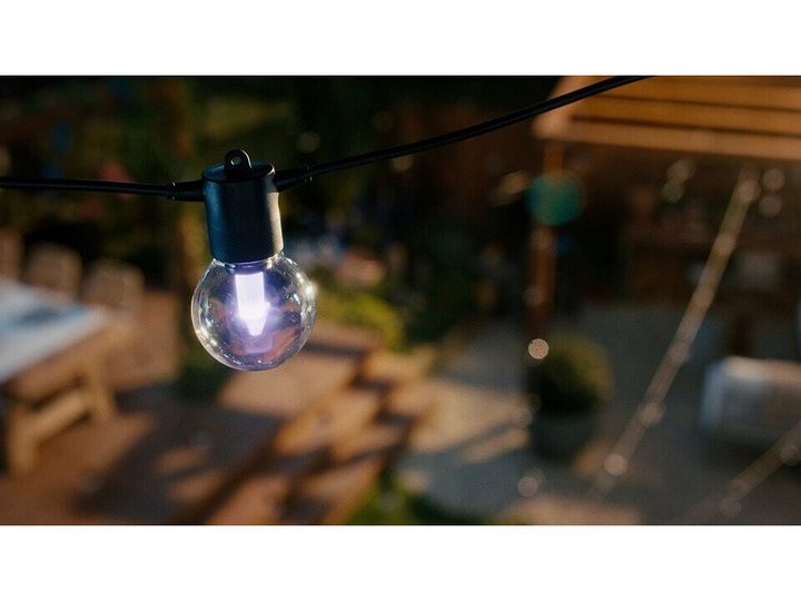Skap en koselig atmosfære eller festlige farger rundt terrassen, balkongen eller andre uteområder. Denne lysslyngen med knusningssikre globepærer avgir et strålende lys i mettede farger eller hvitt lys, enten du velger en myk lysgradient eller animerte lyseffekter. Det sikre lavspenningssystemet gjør det enkelt å koble til en eksisterende stikkontakt via den medfølgende strømforsyningen. De integrerte fullfargede LED-lampene med Chromasync-teknologi får Festavia Globe-lyskjeden til å skinne i sterkt hvitt og mettet fargelys, ideelt for utendørs feiringer. Spiller du musikk? Synkroniser lyset med sangene dine og se fargene bevege seg i takt. Når det er tid for å slappe av, kan du dimme helt ned til et ultralavt lys i alle nyanser fra varmt til kaldt hvitt. Skap ekstra kos med en lysscene eller en spesialeffekt – for eksempel et glitrende «stearinlys». De stilige Festavia-globepærene med sitt iøynefallende Lightguide-design er et vakkert tilskudd til utemiljøet ditt – både når de er slått på og av. Hver Lightguide-pære har et karakteristisk internt lysrør som balanserer farge, lysstyrke og lysretning for optimale effekter. Tilpass akkurat som du ønsker: sett en flerfarget gradient over hele lysslyngen, velg sesongbaserte lysscener eller bruk spesielle lyseffekter som passer til fester, spesielle anledninger eller rolig avslapning. Uansett vær – regn, snø eller sol – er Festavia Globe-lyskjeder designet for utendørs bruk hele året, slik at du ikke trenger å pakke dem bort. Hver holdbare pære med glassutseende er vanntett, værbestandig, bruddsikker og utskiftbar for ekstra trygghet. Festavia Globe er lavspent: bare koble den til et standard strømuttak med den medfølgende strømforsyningen – ingen komplisert omlegging av ledninger er nødvendig – og legg til flere lysslynger til ditt eksisterende lavspente oppsett for å koordinere med dine andre utendørslys. Disse lysslyngene kan ikke forlenges.