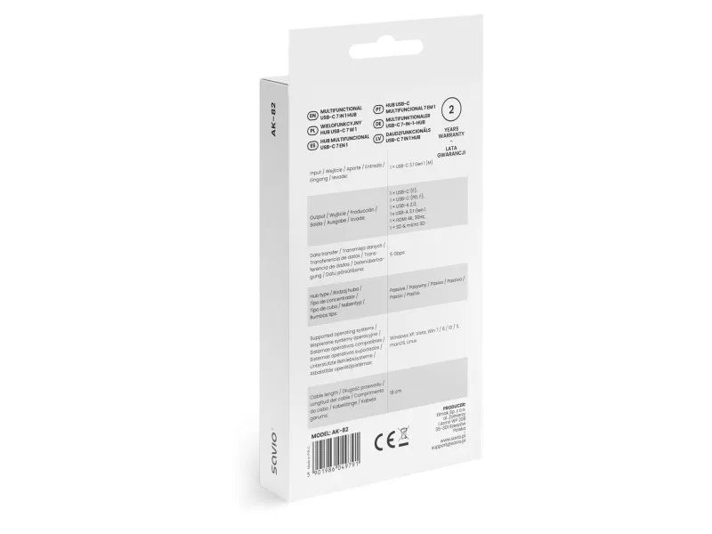 Thanks to its compact design, 18 cm cable, and passive build (no need for external power or software installation), the AK-82 works immediately after being connected to a USB-C port and is perfect both at a desk and on the go.Savio AK-82. Host interface: USB Type-C, Hub interfaces: HDMI, USB Type-C, Compatible memory cards: MicroSDHC, MicroSDXC, SD, SDHC, SDXC. Data transfer rate: 5000 Mbit/s, Maximum refresh rate: 30 Hz, Supported graphics resolutions: 3840 x 2160. Power supply type: USB, Input voltage: 5 V, Output voltage: 20 V. Windows operating systems supported: Windows 10, Windows 11, Windows 7, Windows 8, Windows 8.1, Windows Vista, Windows XP. Quantity per pack: 1 pc(s), Package type: Box