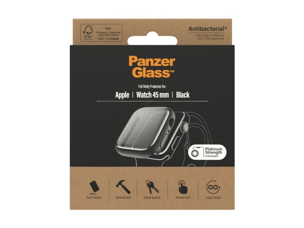 Protect your watch from the hazards of everyday life with PanzerGlass . Accidental bumps against handrails, elevator doors or table corners are no match for this scratch and shock-resistant screen protector glass. It even keeps your watch safe if you knock it down from your nightstand or bathroom sink onto a stone-hard floor. As an added bonus, the smudge-free coating with antibacterial effect kills up to 99.99% of all common surface bacteria and reduces traces of fingerprints and dirt. The screen protector glass is easy to install – just click it on and off as you like – and once installed, you'll never again fear the screeching sound of glass against metal. This may never happen, but if it does, you'll regret not having clicked "add to cart".The full-body glass covers the entire front as well as the curved sides of your watch, while still providing easy access to all button controls. It comes in FSC-labelled packaging that can be recycled.