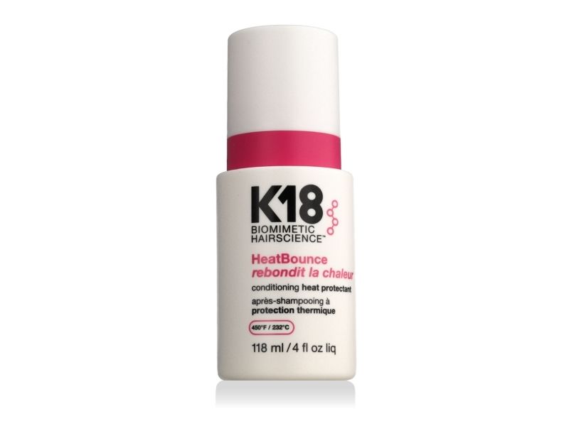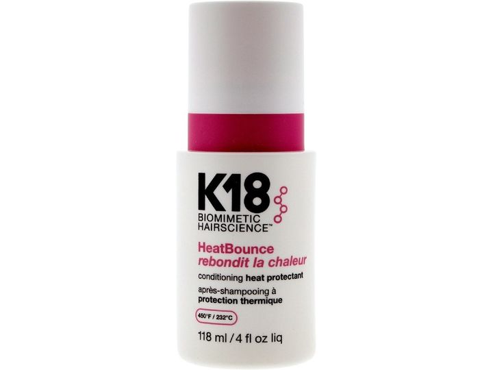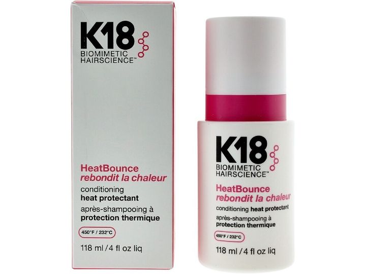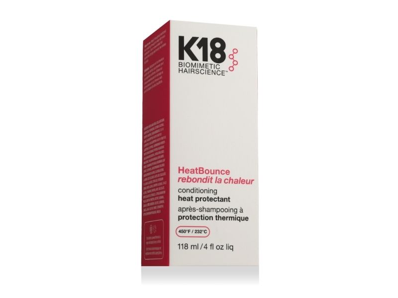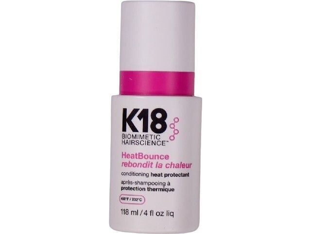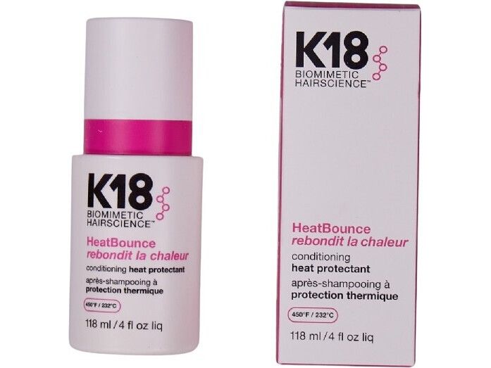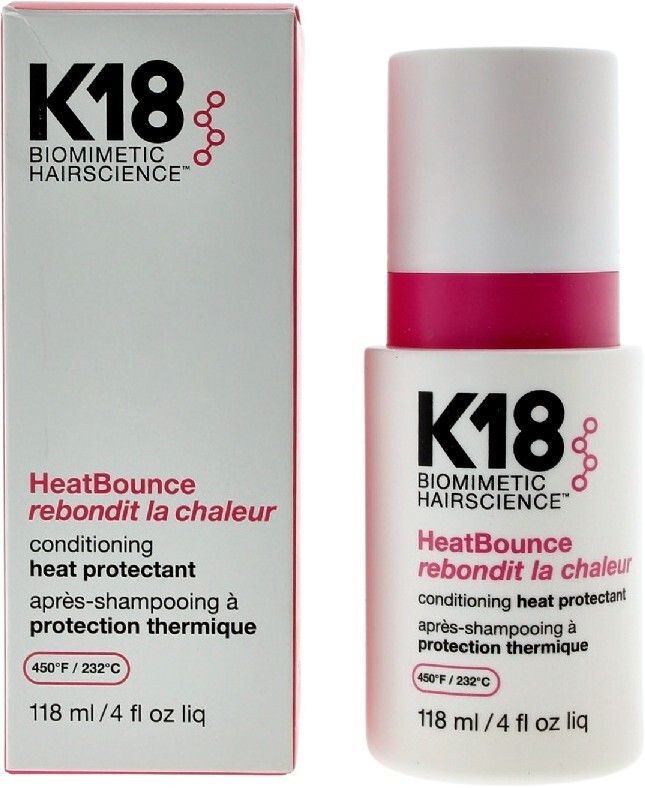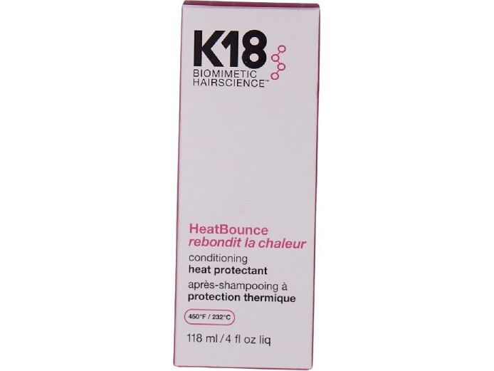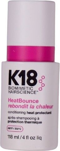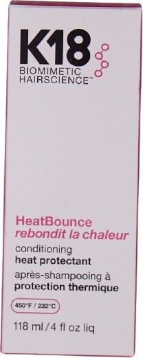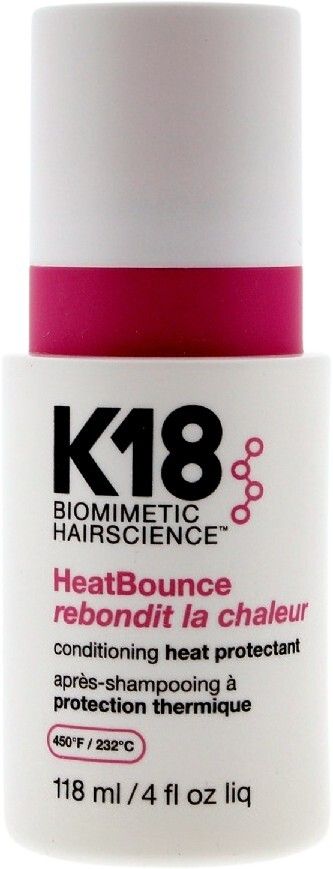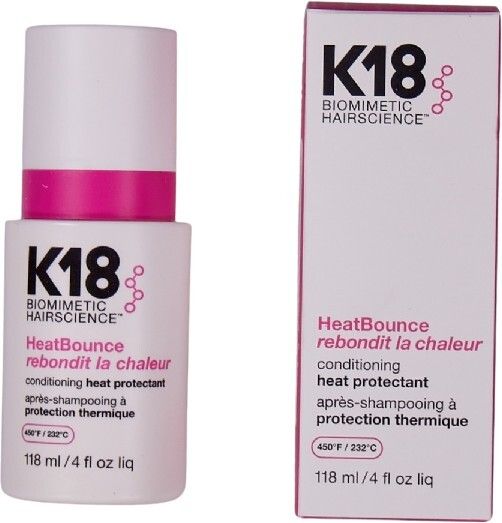 | K18 HeatBounce * Beskytter mot varme opp til 232 °C * Reduserer hårbrudd med opptil 85 % * Forhindrer krus, UV-skader og falming av fargen * Vektløs, fuktighetsgivende formel – uten å tynge håret * Styrker håret helt inn til kjernen * Passer for alle hårtyper og teksturer |