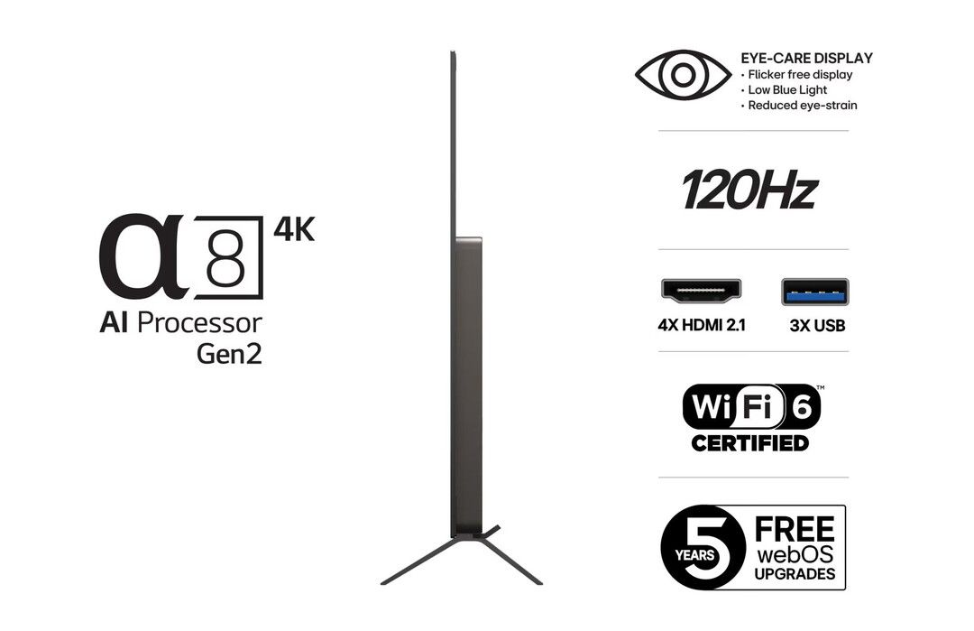 Down-firing Speaker, apt-X teknologi, Simultaneous Audio, LG Sound Sync, Enhanced Audio Return Channel (eARC), AI Acoustic Tuning, AI Sound Pro, Bluetooth Surround klar, WiSA Speaker Compatible, Clear Voice Pro-teknologi, TV Sound Mode Share, rask mediebytte (QMS), Virtual 9.1.2 Up-mix, WOW Orchestra, WOW Interface, a8 AI Sound Pro, AI Clear Sound