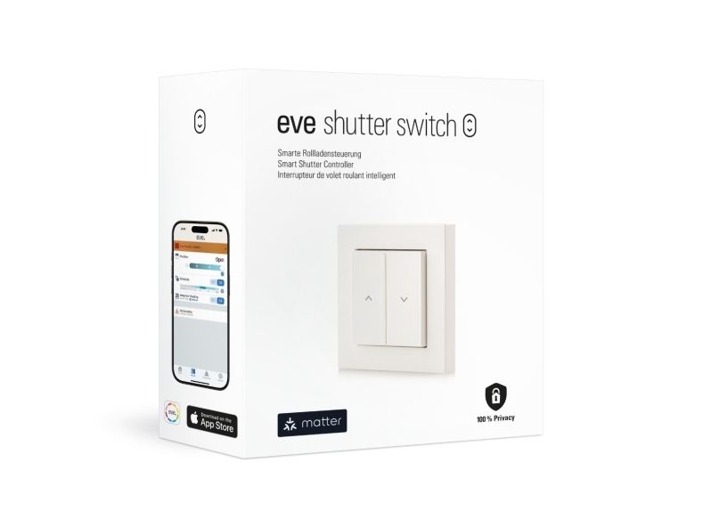 Enjoy the convenience of smart shading with Eve Shutter Switch. Control your shutters using your voice or an app, automate them to open and close at a preferred time to suit your daily routine, and control them from afar. For ultimate comfort, create scenes to control all your shutters and connected devices simultaneously. Adaptive Shading, available in the Eve app for iPhone and iPad, automatically adjusts your shutters based on the sun’s position – keeping rooms cool and comfortable while still letting in natural light. Eve Shutter Switch features future-proof technology with Matter, cutting-edge Thread networking, and no tracking whatsoever – for a universal and rock-solid smart home that honors your privacy. Let your entire family control your home, no matter if they use an iPhone, Android device or call upon Alexa, Siri or Google Assistant.