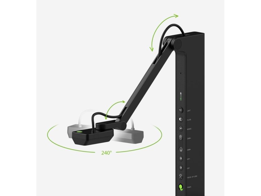 The IPEVO VZ-R ULTRA is designed to offer video quality for presentations and educational purposes. With 13,000,000 pixels from its CMOS optical sensor, this document camera captures images at resolutions up to 4096 x 3072. The f/2.2 lens aperture, combined with an automatic focus adjustment feature, ensures that every detail is sharp and clear, making it ideal for detailed visuals and documents. Featuring multiple video modes, including 1080p, 2160p, and 3072p, the VZ-R ULTRA is capable of producing smooth video at a frame rate of up to 60 fps. The device supports various digital video formats, including MJPEG and YUV, providing flexibility for different applications. Built with user convenience in mind, the camera includes essential features such as an omnidirectional microphone, LED indicators, noise reduction, and easy control buttons for focusing, zooming, and exposure adjustments, ensuring a seamless experience in any environment.