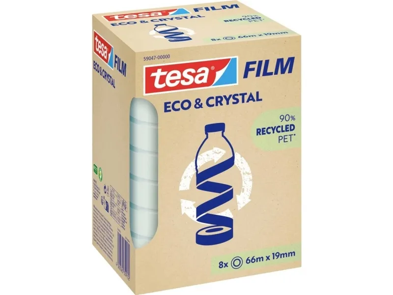 Krystalklar tape af genbrugt materiale; høj gennemsigtighed og stærk vedhæftningskraft; let at rulle ud; fri for opløsningsmidler og ældningsbestandig; miljøvenlig 8-leder med hver 66 m længde.