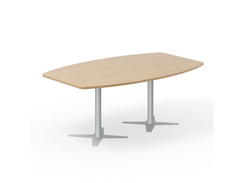 Konferencebord i DNA møbelserie, med bådformet bordplade i eg på hvidt understel. Længde x største dybde er 5000 x 1200 mm.