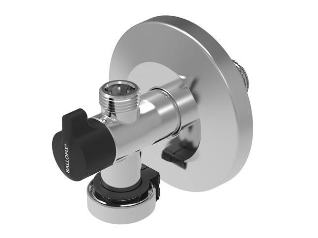 Ballofix krom dobbel vinkelventil 3/4" x 1/2" x 3/8" med tilbakeslagsventil, grep og rosett
