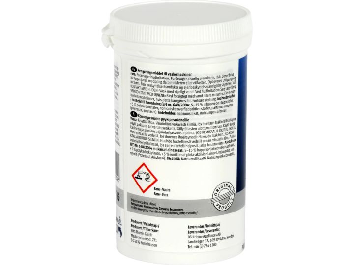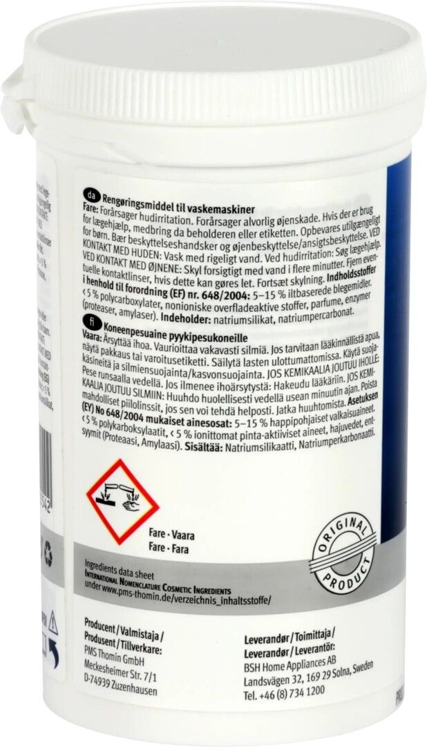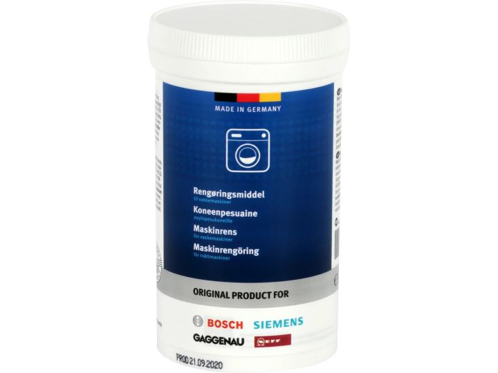 Denne maskinrensen er for rengjøring av trommelen på vaskemaskiner, rengjøringsmidlet hindrer vond lukt i å utvikle seg i vaskemaskinen din. Denne vaskemaskinrens inneholder 200 gram, som er nok til én runde eller én behandling. Dette vaskemidlet rengjør innsiden av vaskemaskinen og kan bidra til å forbedre vaskeresultatene ved å redusere flekker og merker på tøyet fra overflødig såpe. Fjerner effektivt alle avleiringer, holder slanger og pakninger elastiske, reduserer ubehagelig lukt og forbedrer levetiden til vaskemaskinen din. Så ikke nøl med å bruke Bosch Siemens Hausgeräte Maskinrens for vaskemaskiner, det ble anbefalt å bruke en maskinrens hver tredje måned.