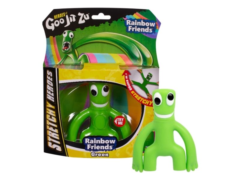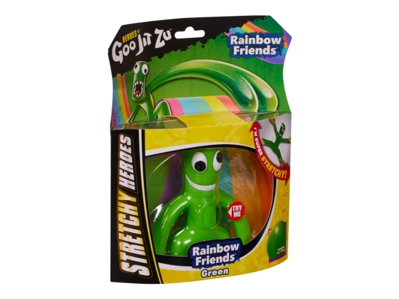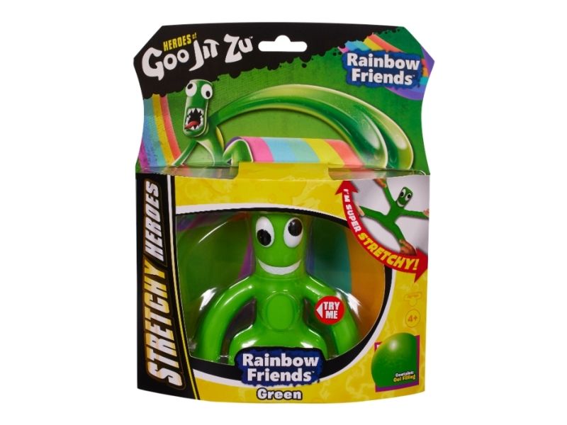 Boys and girls can stretch them up to three times their size. Best thing is they will always come back to their original shape! Heroes of Goo Jit Zu Rainbow Friends are a gooey way for kids to play with no mess.Goo Jit Zu Rainbow Friends-Green. Product type: Stretchy toy figure, Recommended age (min): 4 yr(s), Product colour: Green