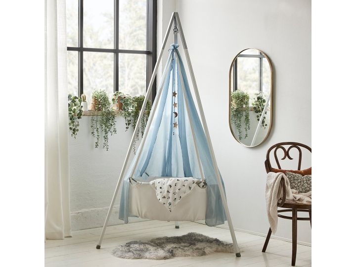 Skærm dit barn fra udefrakommende støj og stimuli med denne fine og lette vuggehimmel til Leander Classic™ vuggen. Himlen indrammer på smukkeste vis vuggen og skaber en tryg lille hule, så din baby lettere kan finde ro. Den bløde, halvtransparente bomuldskvalitet får himlen til at falde flot, når den hænger fra loftet eller i et stativ. Himlen er let at montere med en simpel sløjfe. Vuggestativ fås separat.