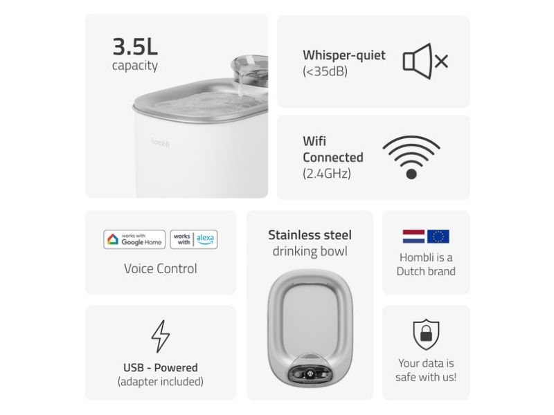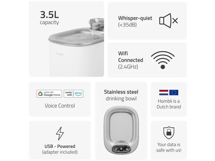 Hombli HBWF-0109, Automatisk vanndispenser for kjæledyr, Rustfritt stål, Hvit, Innendørs, Katt, 3,5 l