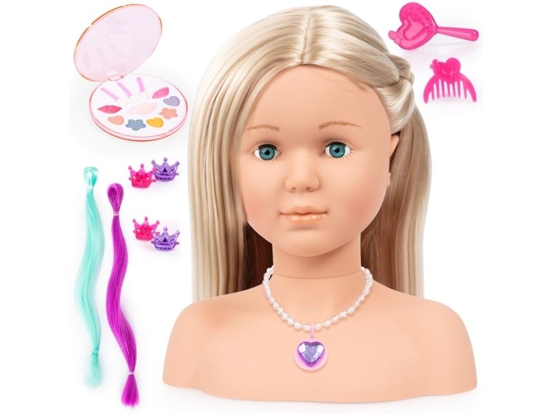 Med Super Model-makeup-hovedet kan alle piger være stylister. Det luksuriøse stylinghoved er 27 cm højt og har et smukt ansigt og smukt blondt hår. Med det medfølgende tilbehør som hårspænder, krøller, børste og kam kan du sætte hendes hår, så ofte du vil. For at fuldende stylingen må en perfekt makeup ikke mangle. Leveres i en smuk showbox.