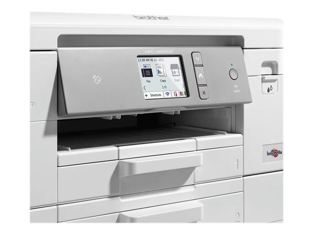 Den stilige MFCJ4540DW er en multifunksjonsskriver med høy kvalitet som tilbyr funksjonalitet for utskrift, kopiering, skanning og faksing. Skriv ut fra arbeidsstasjonen, hvor som helst i huset eller fra din mobile enheten via de trådløse alternativene. Med NFC-kompatibilitet kan du også skrive ut raskt og enkelt met et sveip på mobilen eller nettbrettet.