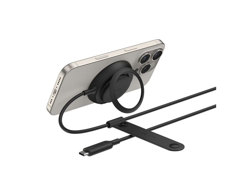 The Belkin UltraCharge wireless charging stand is designed to enhance your charging experience for cellular phones and wireless earphones. With its 2 m USB-C cable, the charger offers flexibility in placement while maintaining efficient power delivery of 25 W. The product is made of 85% recycled plastic, underscoring a commitment to sustainability, while also boasting MagSafe compatibility for seamless device alignment. Enjoy the ease of use with a built-in kickstand, magnetic alignment, and integrated finger loop for added grip, making it a practical addition to any setting. Chillboost technology ensures efficient charging, keeping devices cool during the process.
