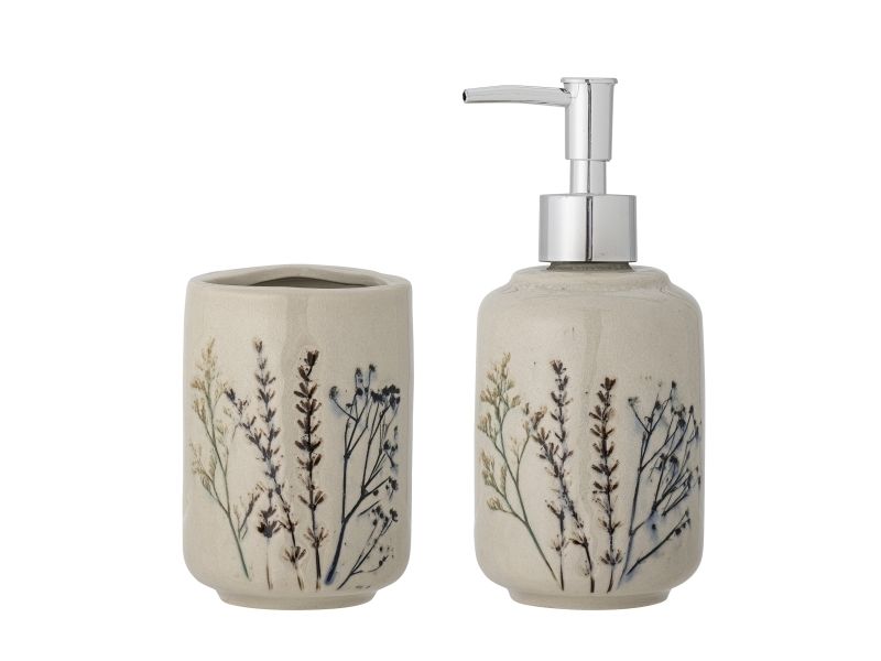 Bea Sæbedispensersættet fra Bloomingville er fremstillet af stentøj og glaseret i en beige nuance med hånddekorerede og håndtrykte blomstermotiver i den krakelerede glasur. Perfekt på badeværelset til sæbe og tandbørster eller i køkkenet til opvask og børste. De håndlavede detaljer sikrer, at hvert sæt er unikt.