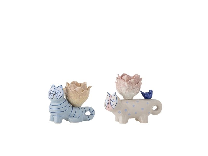 Missy Lysestagen fra Bloomingville kommer som et sæt af to og forestiller katte med blomsterformede holdere til stearinlys på ryggen. De er lavet af stentøj og dekoreret i håndmalede pastelfarver. Små variationer kan forekomme og gør hvert sæt unikt.