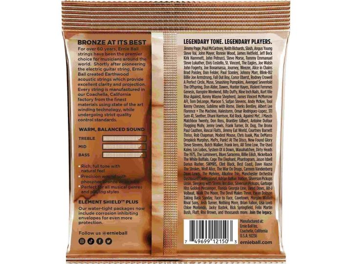 Ernie Ball Earthwood Phosphor Bronze akustiske gitarstrenger er laget av 92 % kobber, 7,7 % tinn og 0,3 % fosfortråd viklet rundt en tinnbelagt sekskantet stålkjerne. Disse gitarstrengene har en lys oransje, gylden farge og gir en myk, klangfull lyd med utmerket klarhet.