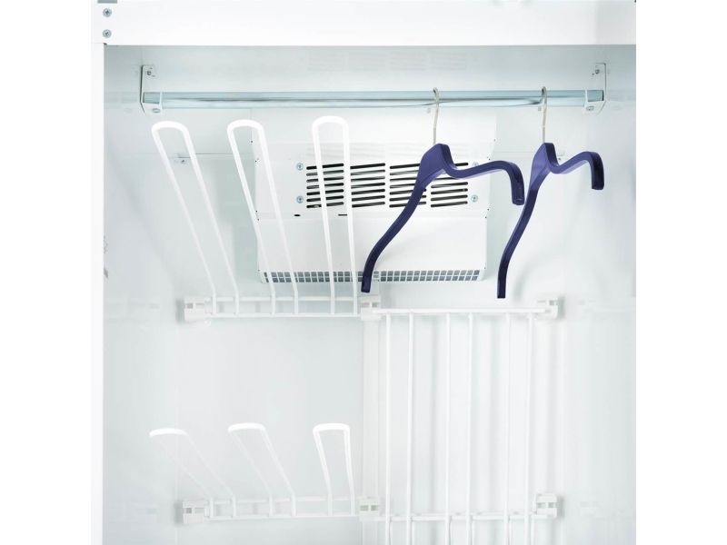 En unik funktion ved dette skab er den indbyggede sensor, som automatisk slukker skabet, når tøjet er tørt. Dette beskytter tøjet mod overophedning og sparer energi ved at sikre, at tørringen stopper på det rette tidspunkt. Derudover kan lågen vendes til både højre eller venstre, hvilket gør skabet fleksibelt til forskellige rumopstillinger.