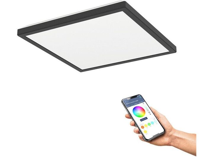 LED-loftlampen ROVITO-Z fra Smart Home-sortimentet connect.z imponerer med et moderne design og innovativ teknologi. Den kvadratiske loftslampe med en længde på 29 cm, en bredde på 29 cm og en højde på kun 3 cm passer perfekt ind i enhver nutidig indretning. Huset er lavet af sort plastik, mens den hvide plastskærm sikrer en jævn og blændfri lysfordeling. De integrerede LED'er giver dig mulighed for at tilpasse lyset helt efter dine ønsker. Du kan vælge mellem varm hvid, neutral hvid og kold hvid belysning samt et bredt udvalg af RGB-farver. Både det direkte og det indirekte lys kan tændes og slukkes separat samt dæmpes. Lampens betjening sker nemt via den gratis app (AwoX Home Control), som tilbyder funktioner som dæmpning, timer, tilstedeværelsessimulering og mere. Takket være Bluetooth- og ZigBee 3.0-teknologi kan du desuden styre lampen via kompatible stemmeassistenter som Amazon Alexa eller Google Assistant. Derudover er betjening også mulig via en separat tilgængelig fjernbetjening.