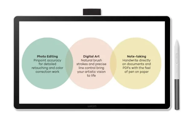 Wacom One 14. Connectivity technology: Wired, Resolution: 2540 lpi, Working area: 309 x 174 mm. Display diagonal: 35.6 cm (14"), Display: IPS, Aspect ratio: 16:9. Product colour: Black, White, Tilt angle range: -60 - 60°, Compatible operating systems: Windows 10 and later macOS 13 and later The latest version of ChromeOS. Width: 336 mm, Depth: 201 mm, Height: 10 mm. Package width: 365 mm, Package depth: 230 mm, Package height: 55 mm