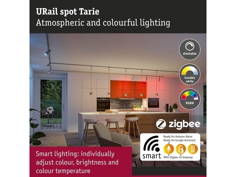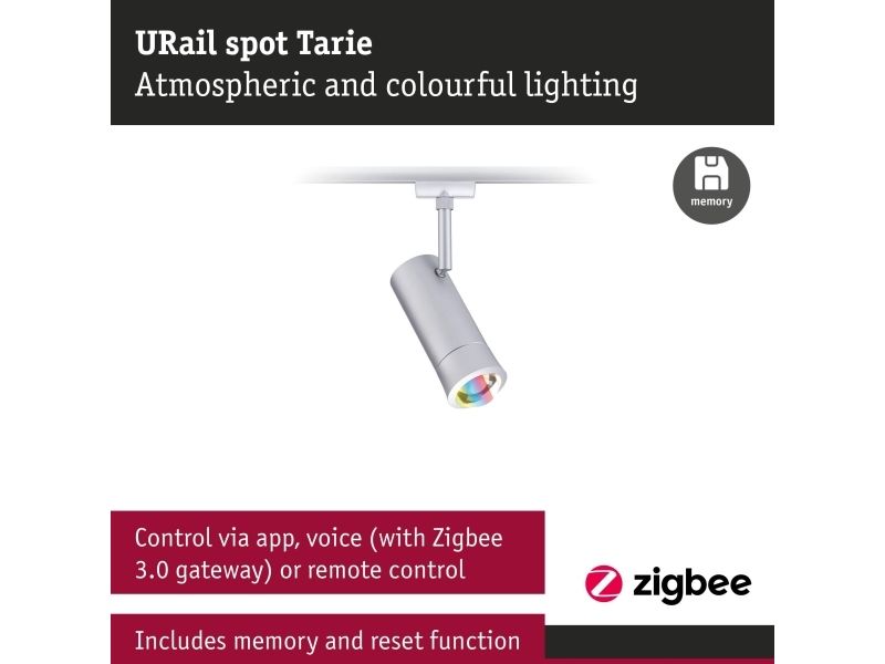 Den smarte URail-spot Tarie i mat krom forener moderne teknik med elegant design. Den kan justeres individuelt og sørger takket være kuglelejet for en dekorativ lysafgivelse, helt uden blænding. Skinnespotten kan integreres problemfrit i eksisterende ZigBee Smart Smart Home-systemer og styres nemt via talekommando, via gatewayen eller via fjernbetjeningen (for eksempel med Gent 1 eller 2). Uanset om lysstyrken skal tilpasses individuelt, forskellige farvetoner vælges eller stemningsfulde lysscenarier skal kreeres - mulighederne er næsten ubegrænsede! Skinnespotten kan uden problemer integreres i både nye og allerede installerede URail-systemer. Sammen med de tilsvarende URail komponenter opstår et helt individuelt lyssystem med en samlet effekt på op til maks. 1000W.