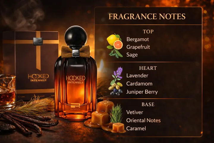 | Rue Broca Hooked Intensely - er en intens og maskulin orientalsk eau de parfum, skapt for mannen som ønsker en varm, fengende og selvsikker signaturduft. Duftnoter - Toppnoter: Rosa pepper, bergamott - Midtnoter: Kanel, lavendel - Basenoter: Vanilje, tobakk, rav Duftprofil. - Duftfamilie: Orientalsk – krydret – aromatisk - Stil: Maskulin, varm, sensuell og intens Hooked Intensely er en varm og maskulin orientalsk duft for menn med noter av rosa pepper, kanel, vanilje, tobakk og rav. Intens, sensuell og perfekt for kvelden – i samme duftstil som Armani Stronger With You. |
