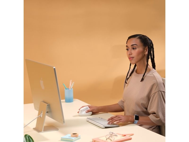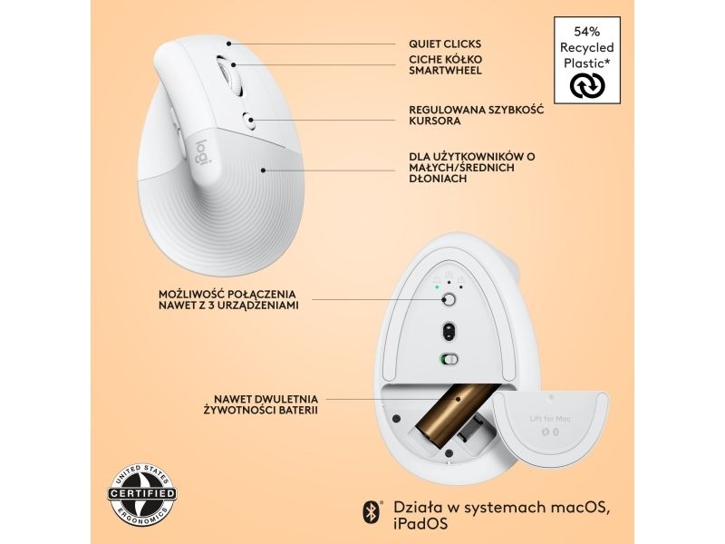 Logitech Lift vertikale ergonomiske mus for Mac er fullt ut kompatibel med macOS og kompatibel med iPadOS - med to års batteritid pakket inn i ett AA-batteri.