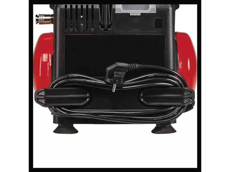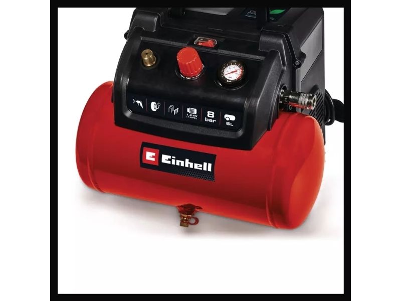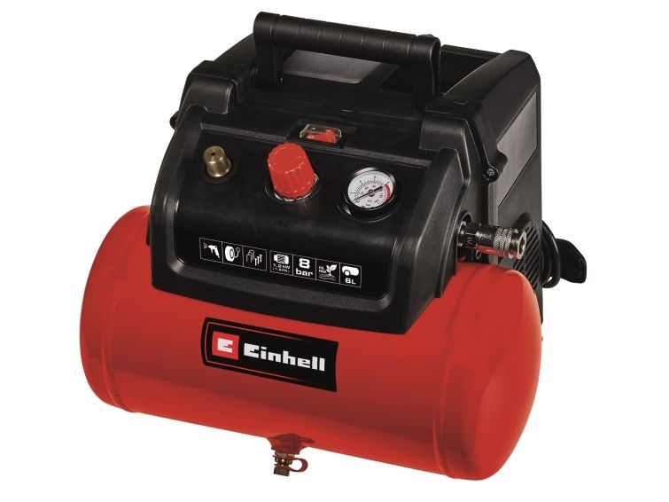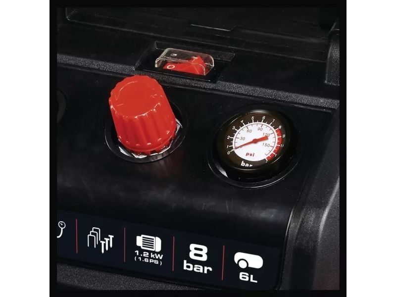Oil-free, service-free pump for low maintenance requirements Mobile compressor with a 6 litre tank Ergonomic design and handle for easy transport Convenient cable storage on the back of the housing Hook and storage tray for optional accessories in the housing Many applications up to 8 bar adjustable via pressure reducer Pressure gauge and quick coupling for regulated working pressure Standing feet for secure standing during operation 10-year guarantee against rusting through of the tank Safety valve ensures high user safety Drain plug for comfortable maintenance Mains supply: 220-240 V | 50 Hz Max. engine power: 1,200 W (1.6 PS Motor speed: 18,000 min^-1 Pump speed: 3,800 min^-1 Suction capacity: 190 L/min Output power at 0 bar: 130 L/min Output power at 4 bar: 77 L/min Output power at 7 bar: 55 L/min Max. operating pressure: 8 bar Tank volume: 6 L Number of cylinders: 1 Pieces Sound pressure level; Lpa: 77 dB (A) Sound power level; Lwa: 97 dB (A)