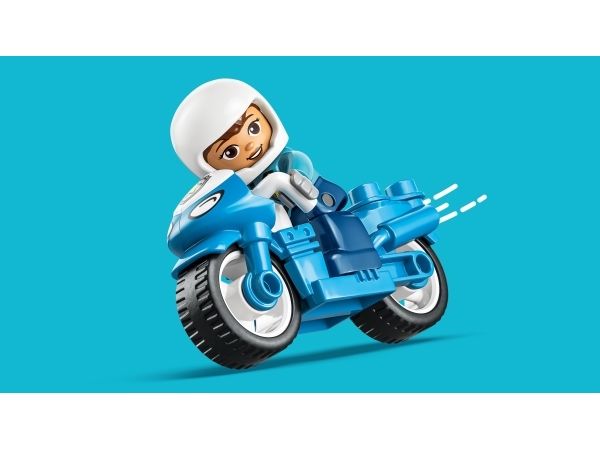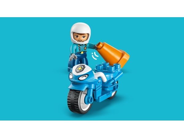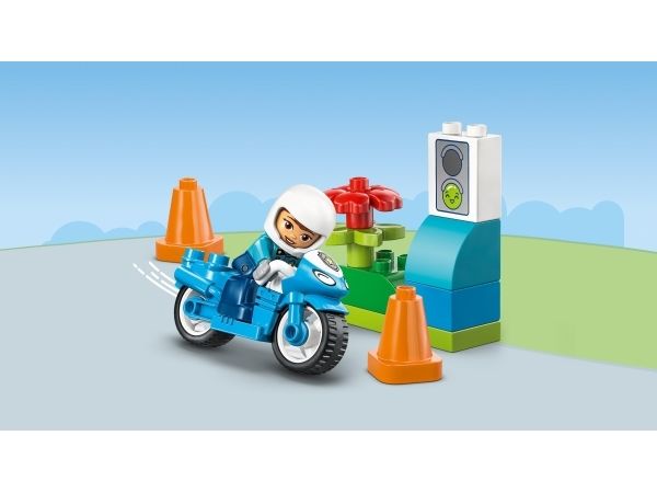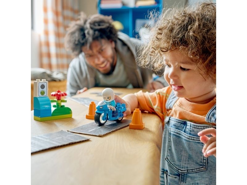 LEGO DUPLO sett består av fargerike lekeklosser, gøyale fortellinger og allsidige figurer, som vekker små barns nysgjerrighet, og bidrar til at de når viktige utviklingsmessige milepæler. Med denne pedagogiske leken kan de øve opp finmotorikken sin ved å plassere LEGO DUPLO politibetjenten på lekemotorsykkelen og styre henne rundt kjeglene. Med denne trafikklys-leken kan foreldre lære smårollingen sin at rødt betyr stopp og grønt betyr kjør av sted! Settet består av 11 deler.