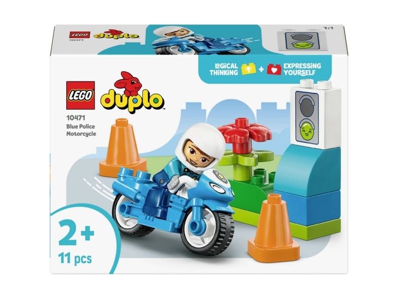 Med lekesettet LEGO® DUPLO® Town Blå politimotorsykkel (10471) får barn fra to år oppleve fartsfylt lek. Denne pedagogiske leken gir små barn muligheten til å finne på historier, hvor de spiller en viktig rolle i samfunnet ved å patruljere gatene med en politibetjent på en tøff LEGO DUPLO motorsykkel. Dette vesle gavesettet passer som flott bursdags- eller overraskelsesgave til barn fra to år som elsker utrykningskjøretøy. Settet inneholder en politifigur, kloss med trafikklys-dekor og to kjegler.