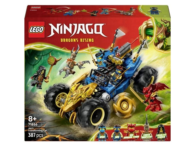 Med byggesettet LEGO® NINJAGO® Jays forvandlingskjøretøy (71856) får jenter og gutter fra åtte år timevis med fartsfylt actionlek. Denne 2-i-1-ninjabilen kan lekes med og stilles ut i to versjoner: vanlig modus eller dragemodus med gullklør, dragehode og roterende kastestjerner (når du vipper opp fronten.