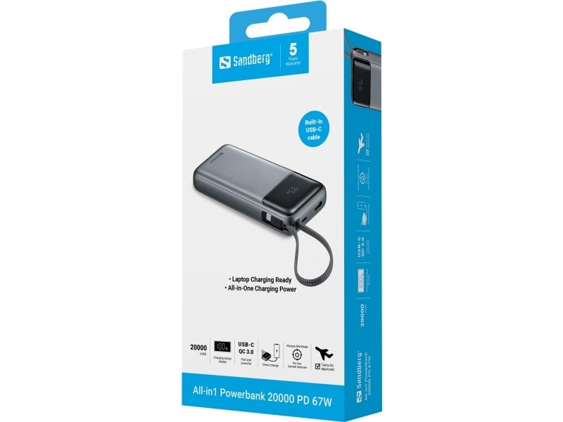 Sandberg 421-29, 20000 mAh, Lithium Polymer (LiPo), 3,7 V, 15 W, Sort, Grå