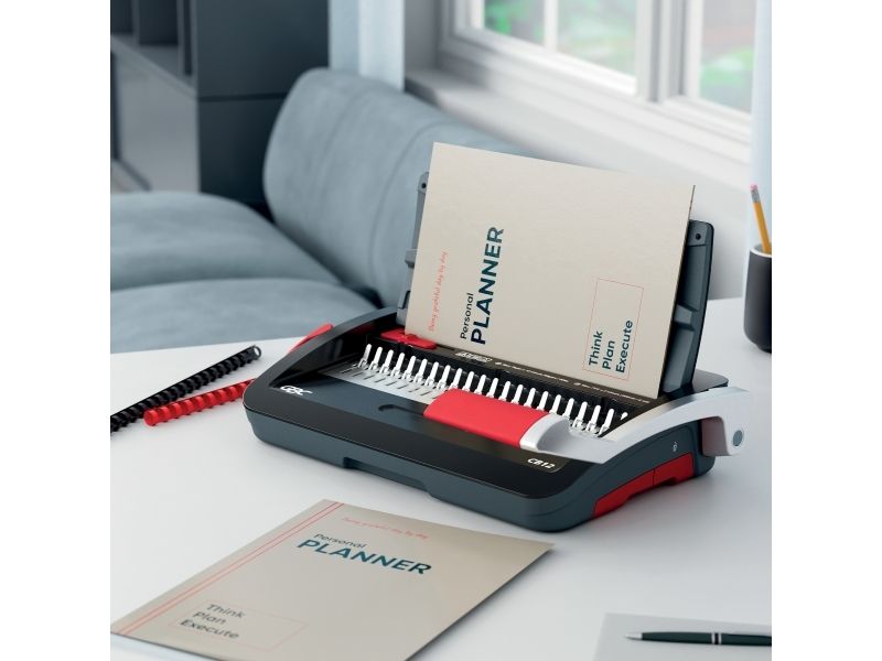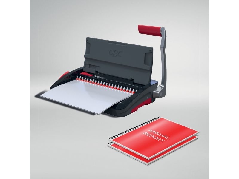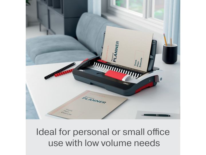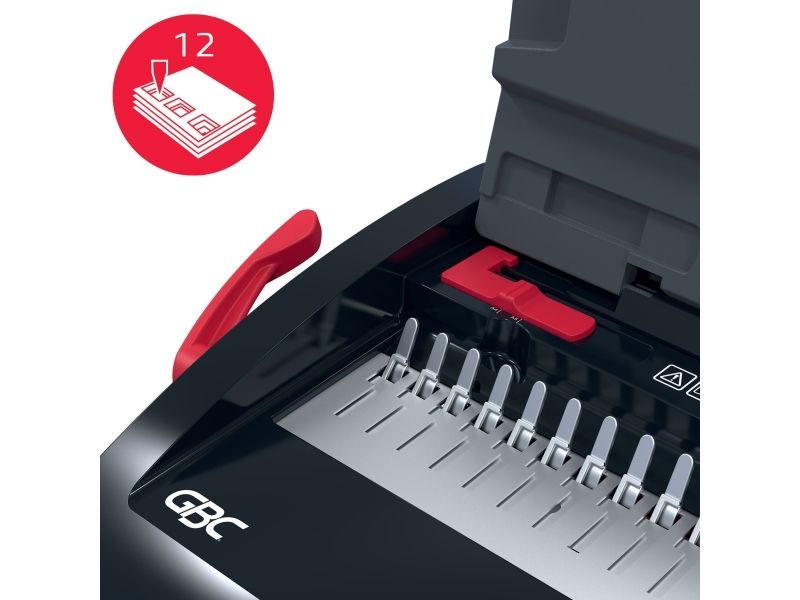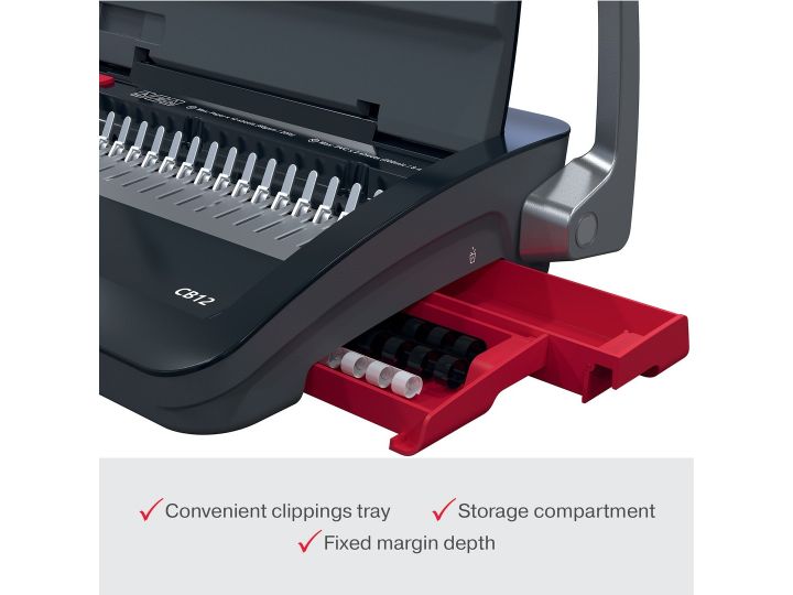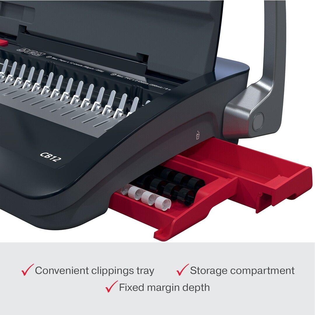 CombBind® CB12 er en pålidelig og kompakt manuel comb indbindingsmaskine, perfekt til personlig brug eller på mindre kontorer med lavt volumenbehov. Den huller ubesværet op til 12 ark (80 g) papir og kan indbinde op til 165 ark ad gangen ved hjælp af 19 mm indbindingsrygge. Dens lette, pladsbesparende design sikrer, at den kan bruges hvor som helst, når som helst og nemt opbevares, når den ikke er i brug. For ekstra bekvemmelighed inkluderer den en bakke til papiraffald for nem bortskaffelse og et praktisk opbevaringsrum. Sort og sølv farve. - Indbinder op til 165 A5/A4-ark (80 g) ad gangen ved hjælp af en 19 mm Comb indbindbindingsryg. - Huller op til 12 ark ad gangen (80 g) - Alsidig indbinding: Indbind nemt A5-dokumenter i liggende format med A5-Comb indbindingsrygge og A4 i liggende format med A4-Comb indbindingsrygge. - Manuel hulning for en ubesværet og jævn indbindingsoplevelse. - Sidemargenjustering for præcis justering og ensartede indbindingsresultater. - Fast margindybde for ensartet indbinding af høj kvalitet. - Skridsikre gummifødder for stabil og sikker placering. - Praktisk udstandsningsbakke og et indbygget opbevaringsrum for ekstra organisering. - Let og kompakt design for nem transport og praktisk opbevaring.