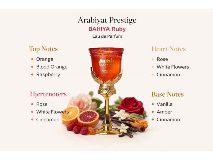 Arabiyat Prestige Bahiya Ruby er en luksuriøs og feminin Eau de Parfum som kombinerer fruktig friskhet med varm orientalsk sensualitet.