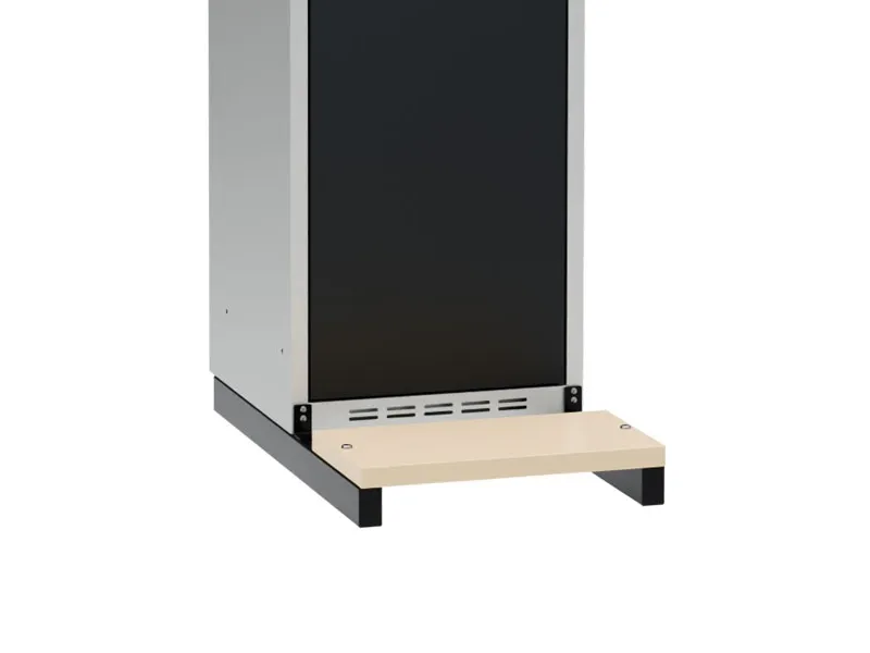 Bænkstel Væg til garderobeskabe med bredde 400 mm. Sæde i birk højtrykslaminat. Helsvejst og pulverlakeret metal. Farve sort, RAL 9005. Totaldybde er 700 mm (passer til skabsdybde 400 mm).