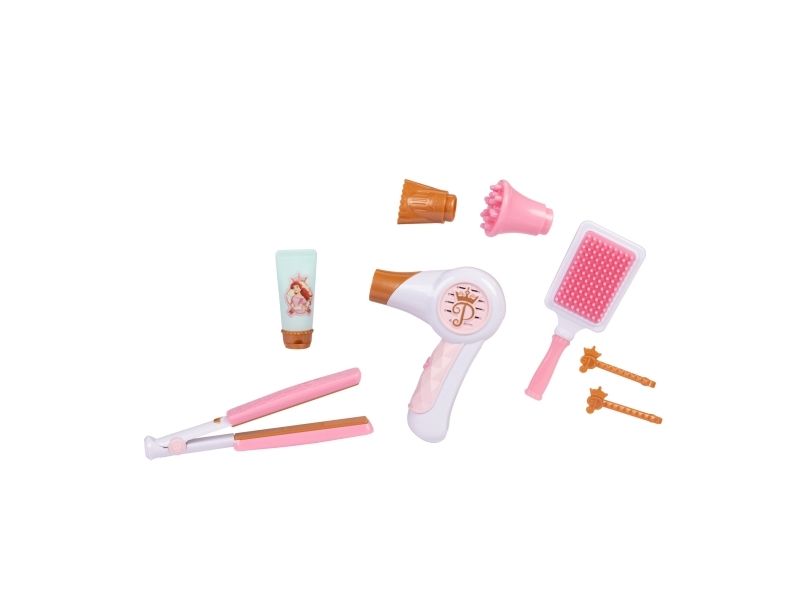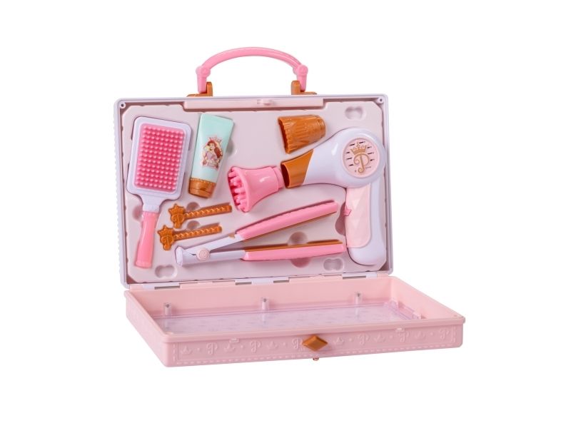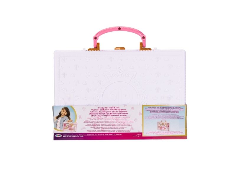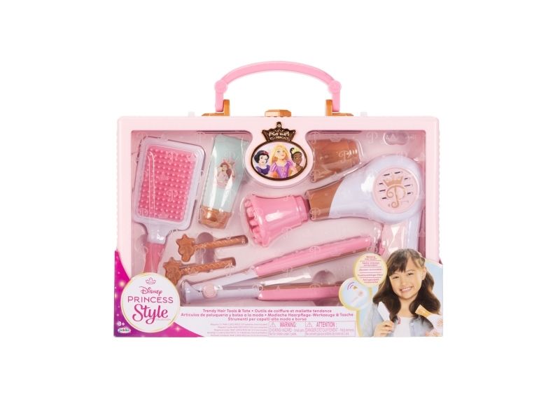 Elegant. unik og super sjov! Disney Princess Style Collection Trendy Hair Tools & Tote er perfekt til enhver prinsesse på farten med fantastisk stil. Denne charmerende og stilfulde hårtaske indeholder 8 sjove hår-legestykker med alt. hvad du behøver for at få dit hår til at se bedst muligt ud. såsom en “funktionel” legetøjs-hårtørrer. diffuser. legetøjs-glattejern. to hårspænder. legetøjs-hårstylinggel og hårbørste. Hårtørreren blæser luft og laver realistiske blæselyde. når den tændes! Den flotte taske viser alle legetøjsdelene frem og har et håndtag. så du nemt kan lege med dem på farten.