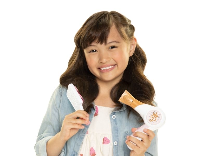 Dette sæt indeholder alt hvad du skal bruge for at blive den perfekte trendy frisør. herunder en “funktionel” hårtørrer. som blæser luft og laver lyd. når den tændes.