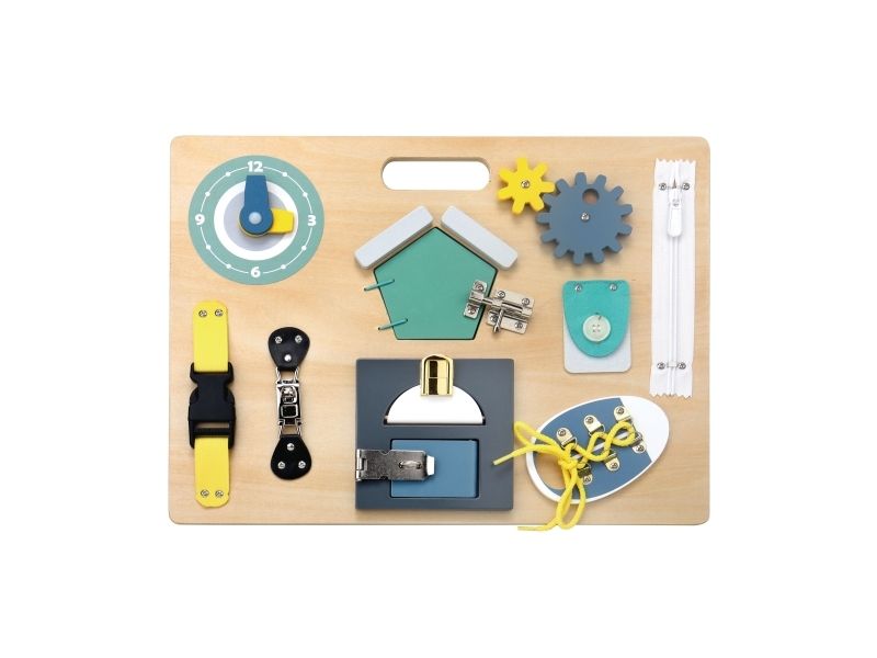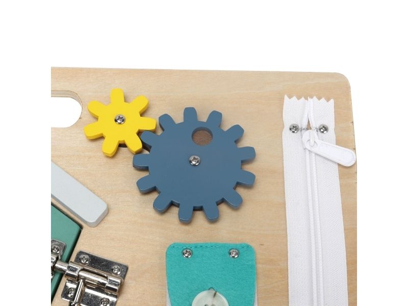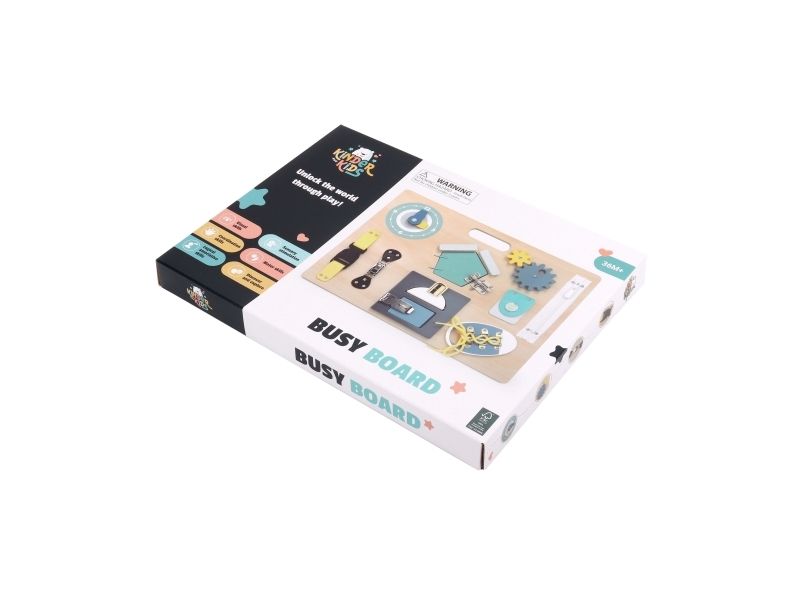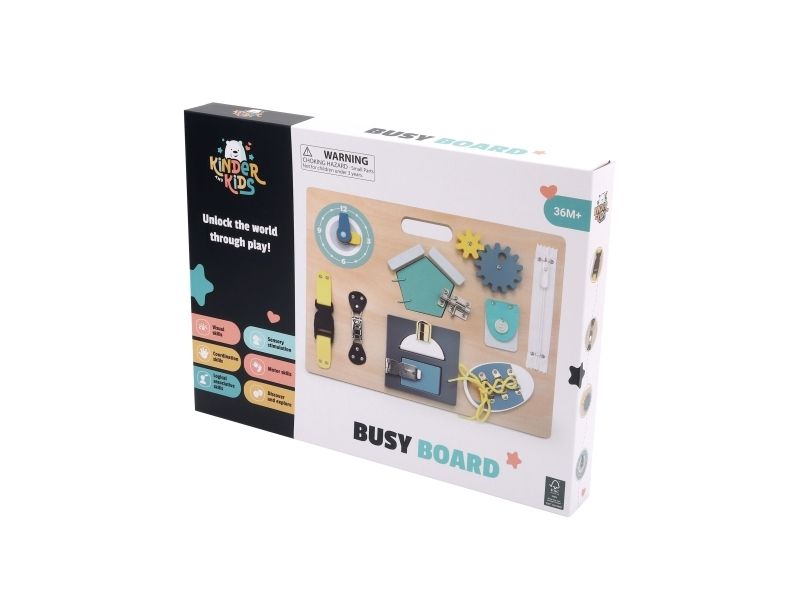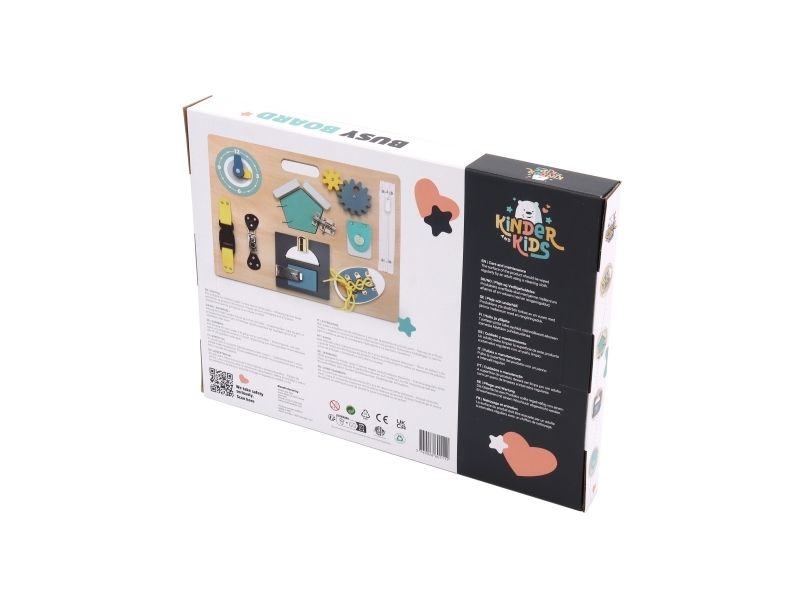 Kinder and Kids Aktivitetstavle er et træbræt med mange forskellige funktioner, der holder små hænder aktive og nysgerrige. Tavlen har gear, låse, snore og andre spændende elementer, som børn kan udforske igen og igen. Det solide design gør aktivitetstavlen oplagt til både detailhandel og institutioner.