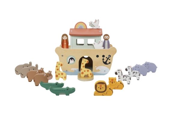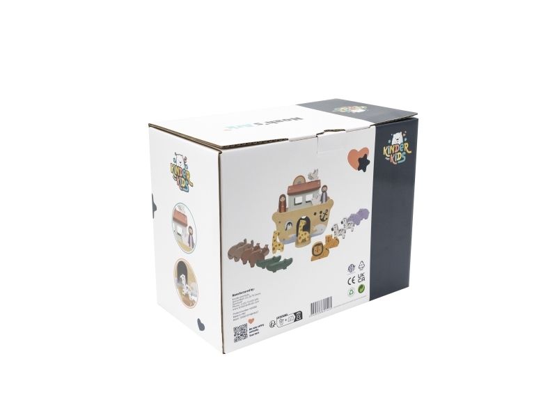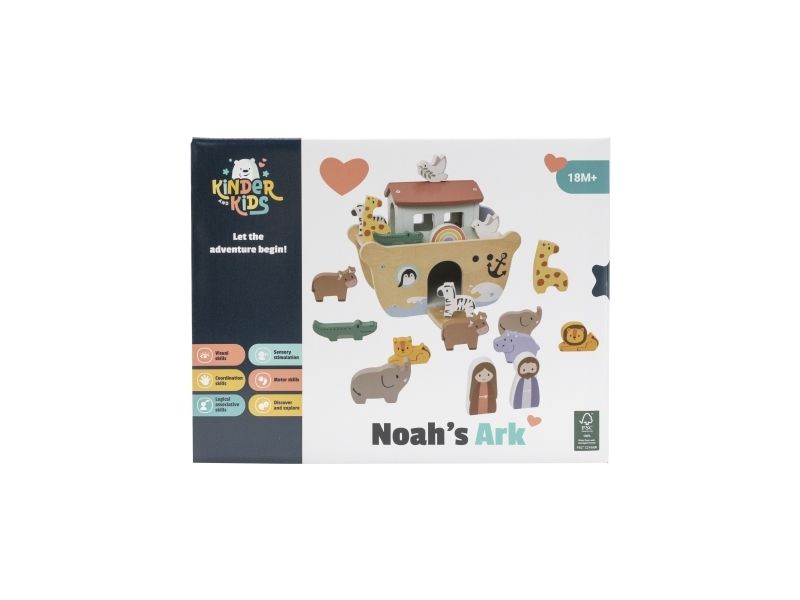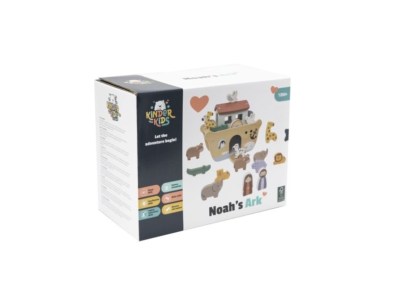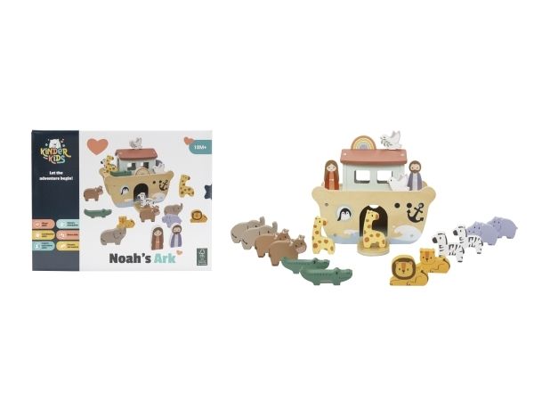Kinder and Kids Noas Ark er fremstillet i træ og giver børn mulighed for at lege med historien om Noas Ark. Sættet indeholder selve arken samt figurer af mennesker og dyr, der kan placeres på eller i båden.