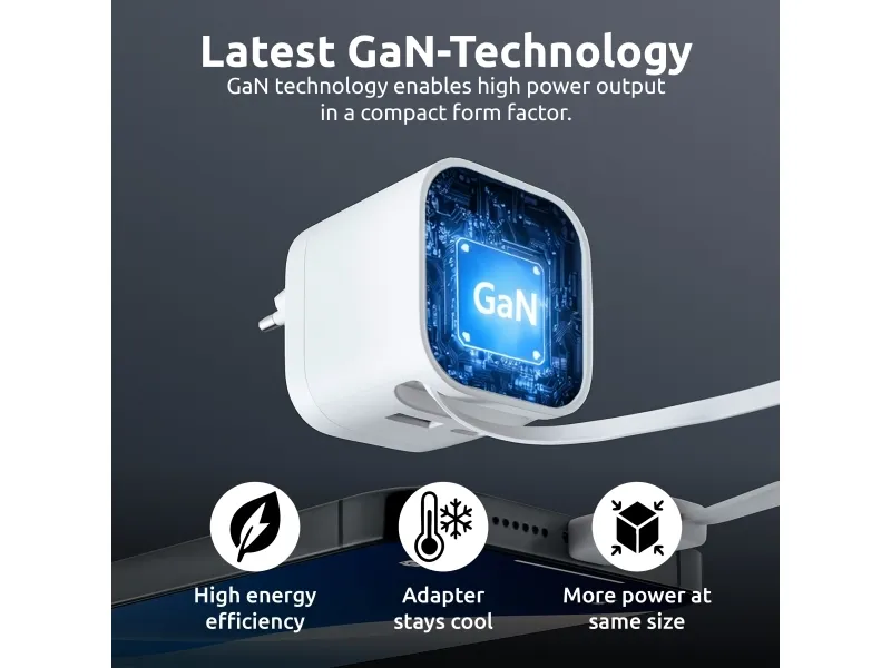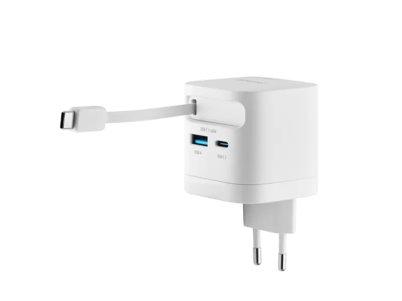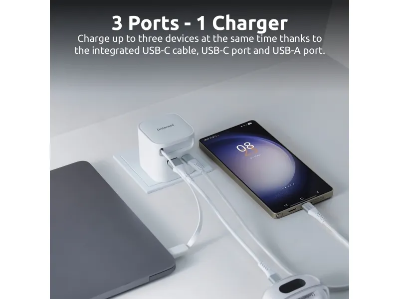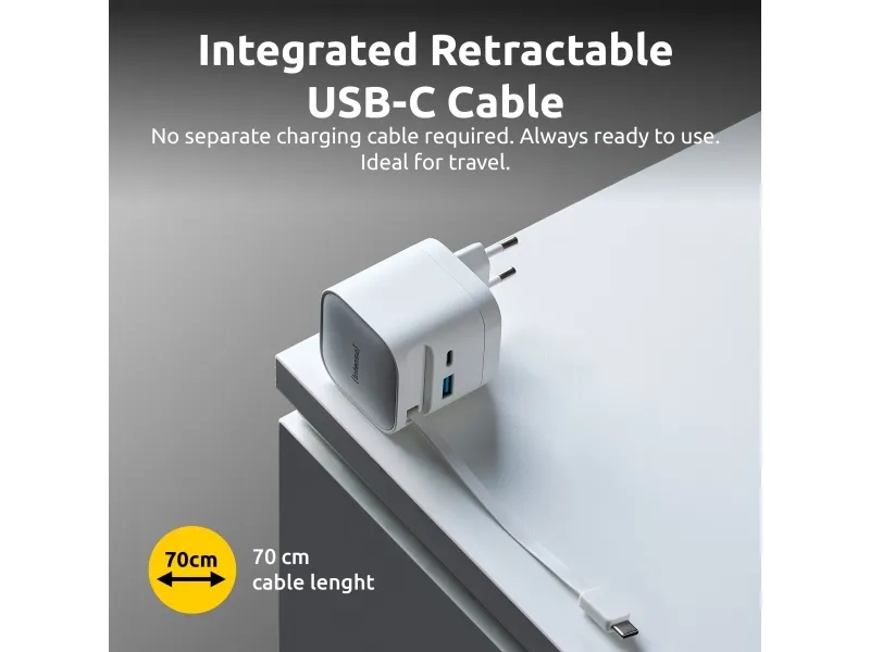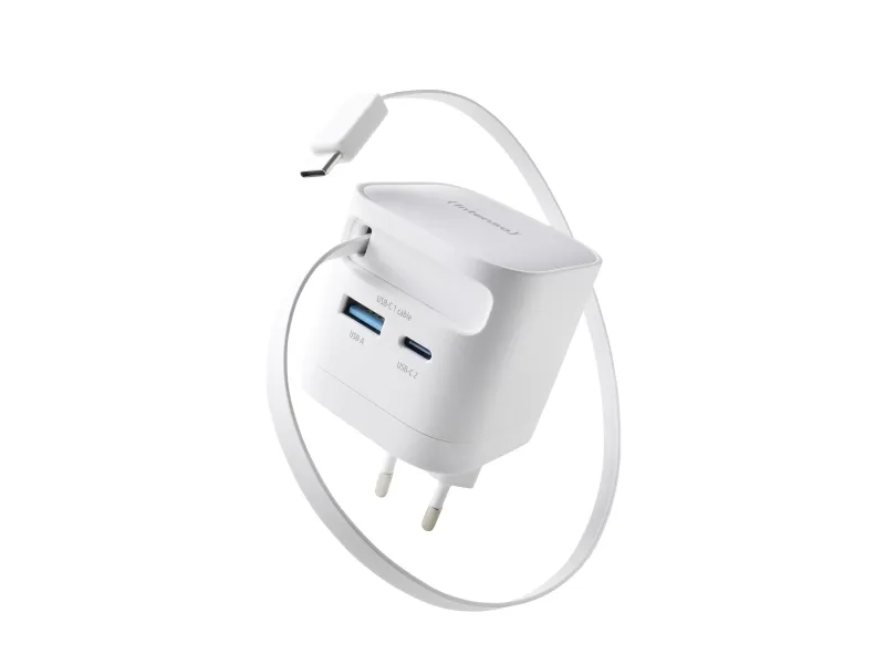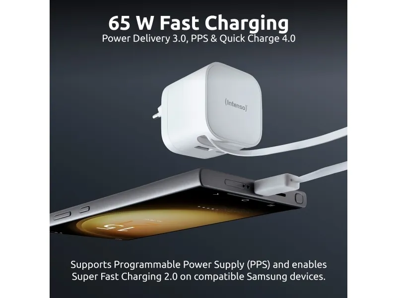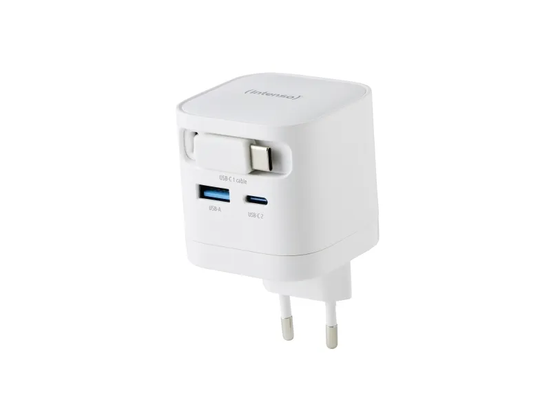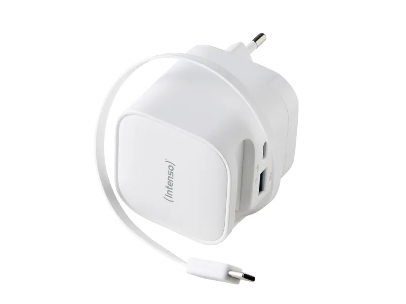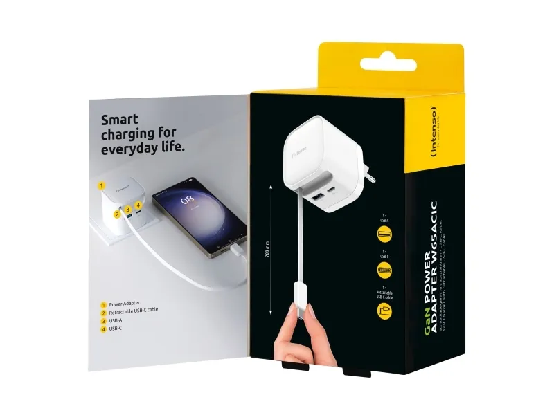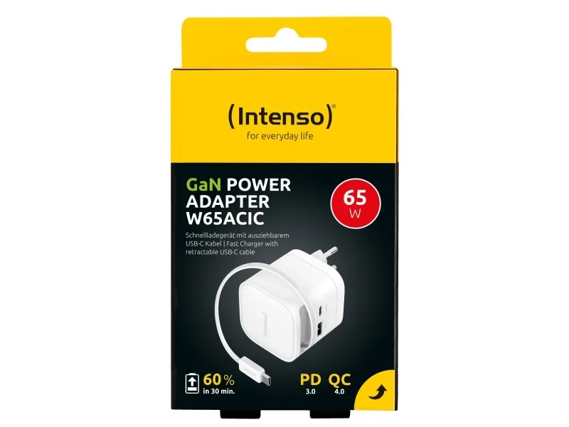 The Intenso W65ACIC is a compact 65 W GaN power adapter featuring an integrated retractable USB-C cable. With support for USB Power Delivery 3.0, PPS and additional USB-C and USB-A ports, it is suitable for charging smartphones, tablets and laptops simultaneously. GaN technology ensures high efficiency, reduced heat generation and a compact form factor, making it ideal for travel, mobile work and everyday use.Intenso 7806520. Purpose: Universal, Power supply type: Indoor, Input voltage: 110 - 240 V. Product colour: Black, Housing material: Plastic. Compliance certificates: CE, UKCA. Sustainability certificates: Triman. Cable length: 0.7 m, Width: 53 mm, Depth: 53 mm