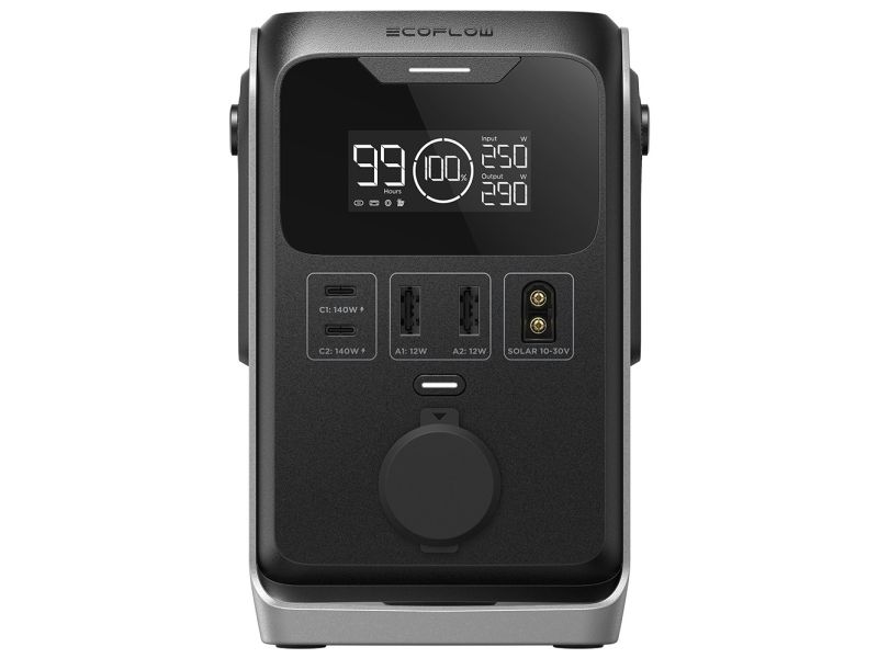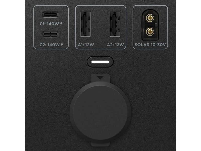 The EcoFlow TRAIL 300 DC station offers two USB-C PD 140 W ports, two USB-A 12 W ports and a 12-volt car socket. This allows you to connect several devices to it simultaneously. This is a great convenience when you use multiple devices in the field or travel with a group of friends - no one will have to wait their turn to charge their phone or laptop anymore!