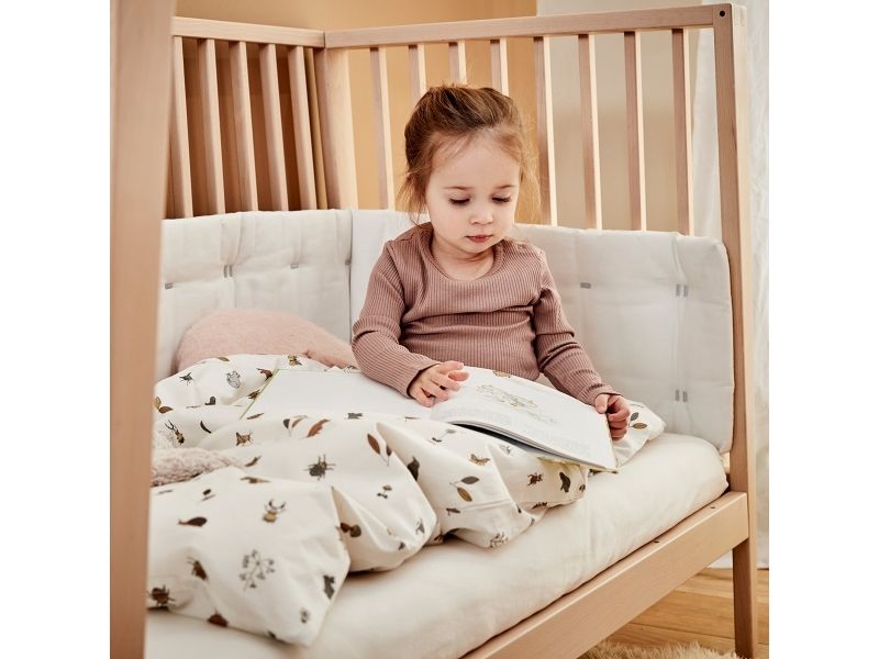 Sengen har fire fleksible indstillinger, så du kan bruge den i mange år. Start med at bruge tremmesengen med løftet bund og høje gavle. Det vil skåne din ryg, når du skal putte din baby. Når dit barn begynder at kunne rejse sig, anbefaler vi, at du sænker bunden. Når der ikke længere er brug for tremmerne, kan du fjerne sengens ene side, så dit barn selv kan kravle ind og ud af sengen. Når sengen er blevet for lille til at sove i, kan du lave den til en hyggelig, lille sofa. Babysengen med åben side må ikke benyttes som sideseng op ad forældresengen. Sengen er ikke godkendt som sideseng.